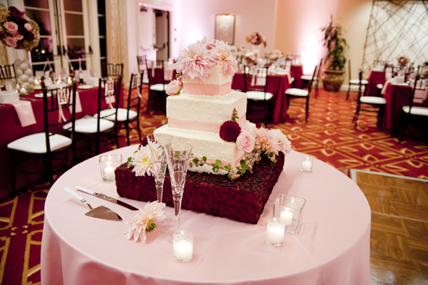 粉色系的婚礼蛋糕,象征着新人从校园里就开始萌芽的纯洁爱情。