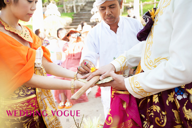 巴厘岛当地婚礼的过程中,一位长者会口念梵文在一旁引导新人,我们大致理解为一种庄重祝福和对神的敬意吧