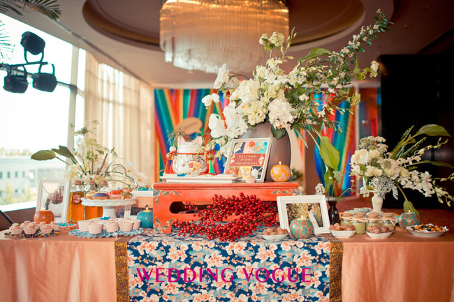 这是一组为日式风格婚礼定制的甜品台。配合婚礼主题“courful”,甜品台也使用了五彩的颜色,并以经典的和风元素樱花为主要图案,装点于各个角落。器皿和花艺的搭配同样协调优美,令人喜爱。