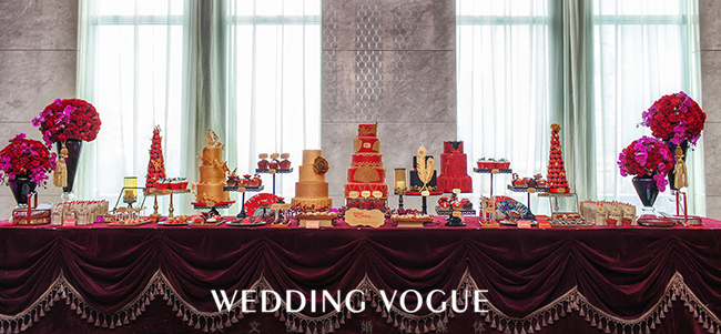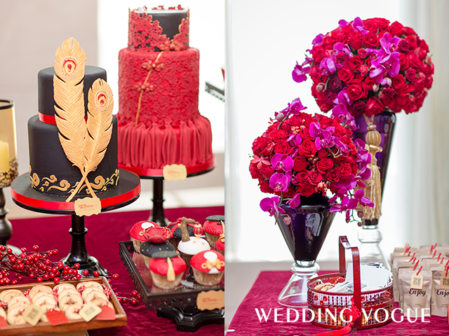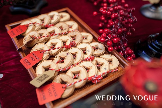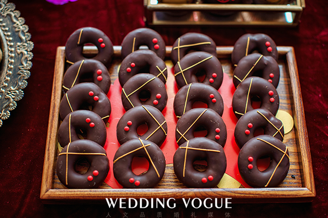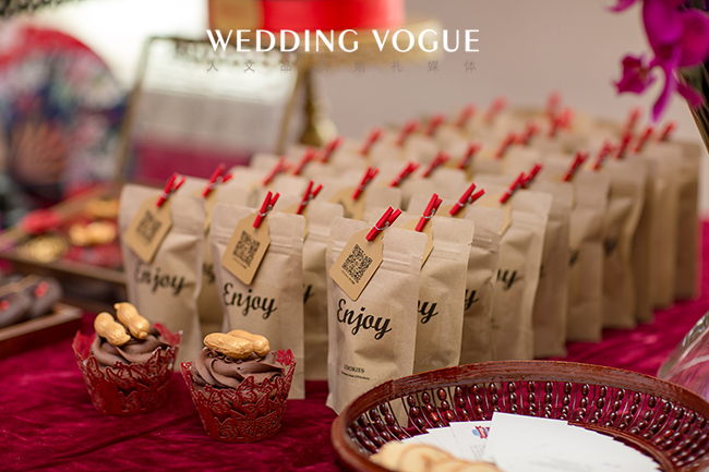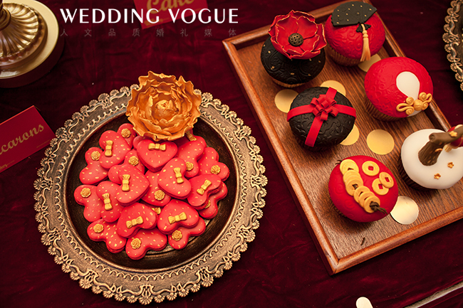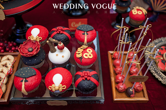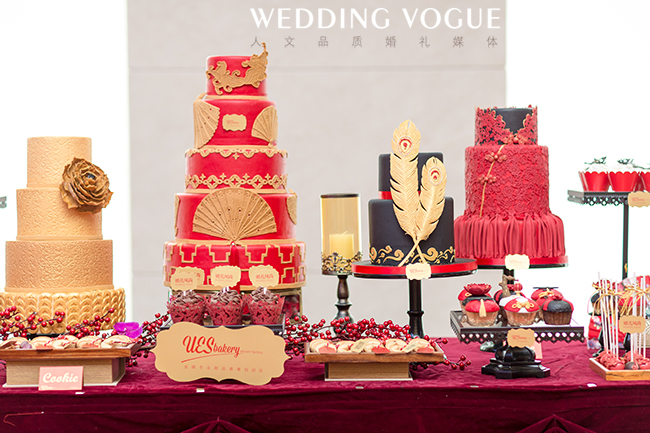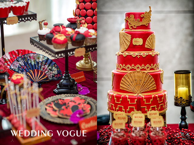 在婚礼风尚3月份合作伙伴答谢宴上,由UESbakery联手打造的一组传统中式甜品设计备受瞩目。以中国红为主色调,采用中国结、折扇、灯笼、烛台、牡丹等文化元素,结合旗袍式双层蛋糕、铜钱串装饰的甜点、大红色马卡龙、雕花式cookie与复古中式器皿错落有致的布置,再搭配花逸良品精心准备的花饰,呈现了一处别出心裁、独具创意的中式甜品区。