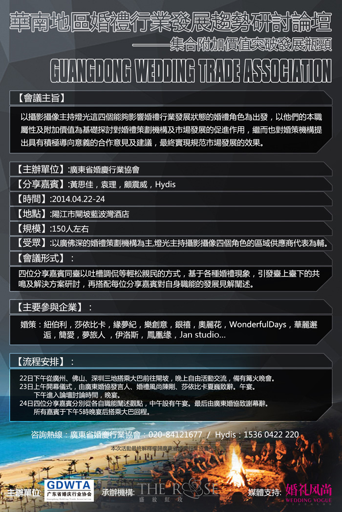 【咨询热线】:广东省婚庆行业协会:020-84121677 / Hydis:1536 0422 220