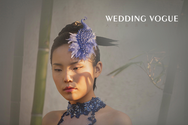 在静思园一步一景的园林内,任意一处亭台楼阁、茂林修竹都是片子拍摄的灵感来源,蓝色鱼尾式礼服搭配造型师自制的孔雀图案发饰更显古典大气,新娘置身其中,摄影师拿起相机,结合自然光,像是在创作一幅江南园林风格的立体画卷。