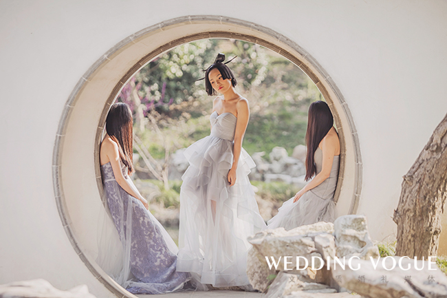 烟灰色婚纱同样十分应景,给人一种飘渺的梦幻感,搭配古典的发饰,在新娘不经意的举手投足间给人一种从国画里走出来的错觉,神秘且空灵。