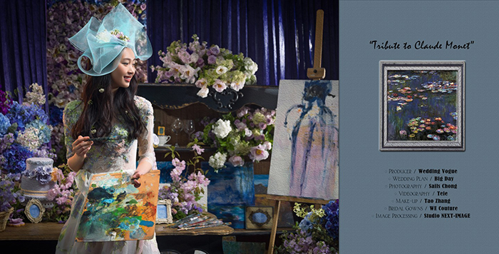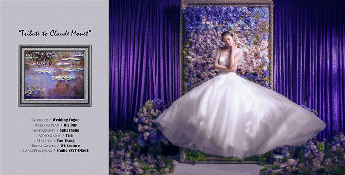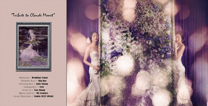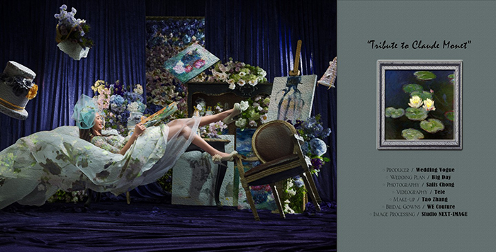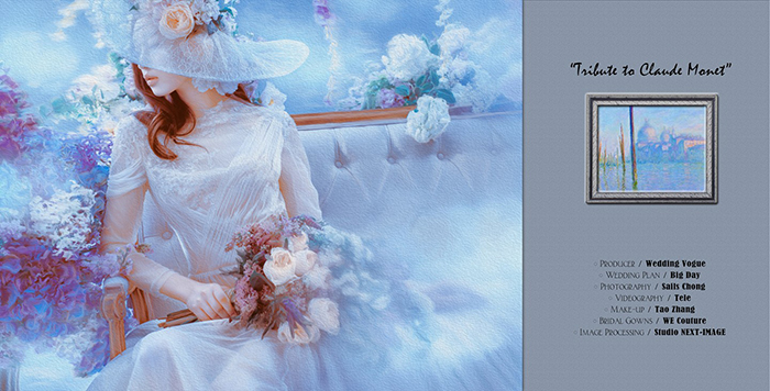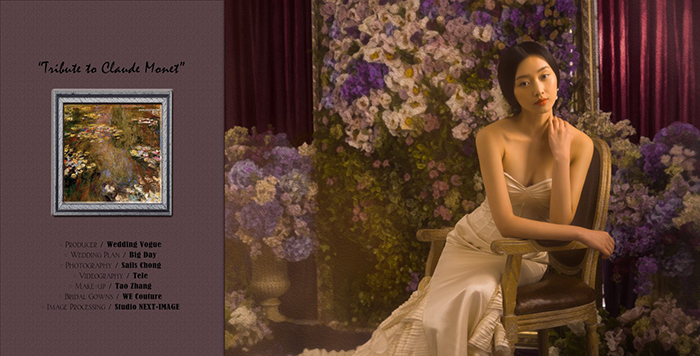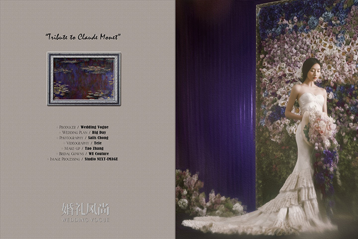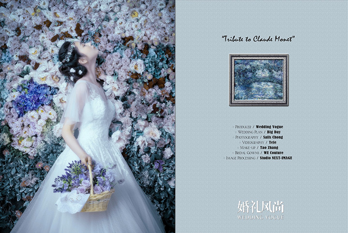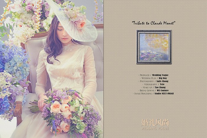 莫奈,法国印象画派的创始人之一,擅长从自然的光色变幻中抒发瞬间的感受。他的花园系列作品,尤为经典。莫奈的画离不开大自然,各式花朵、天空、流水都是构成其创作的元素,他勾勒的花园永远洋溢着春的气息。5月9日,婚礼风尚联合合作伙伴以莫奈风为创作灵感进行风尚新娘的大片拍摄,希望将艺术与婚礼进行更好的融合。