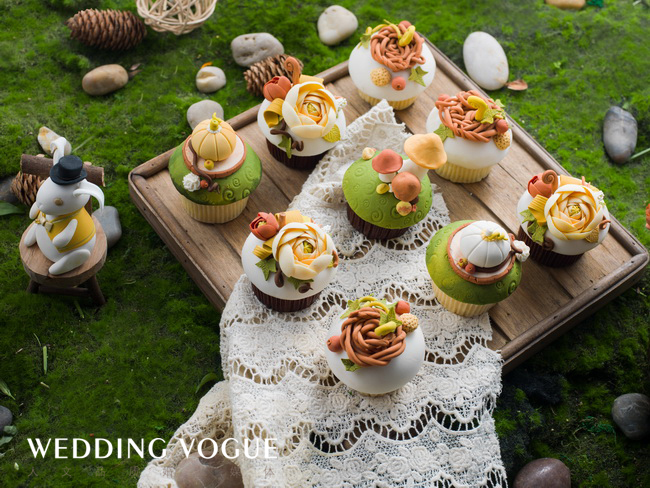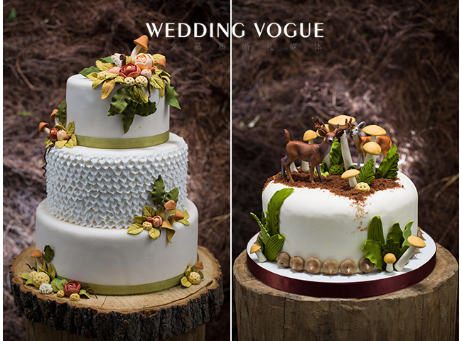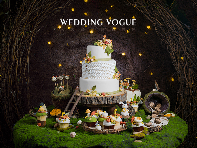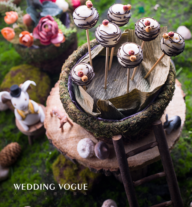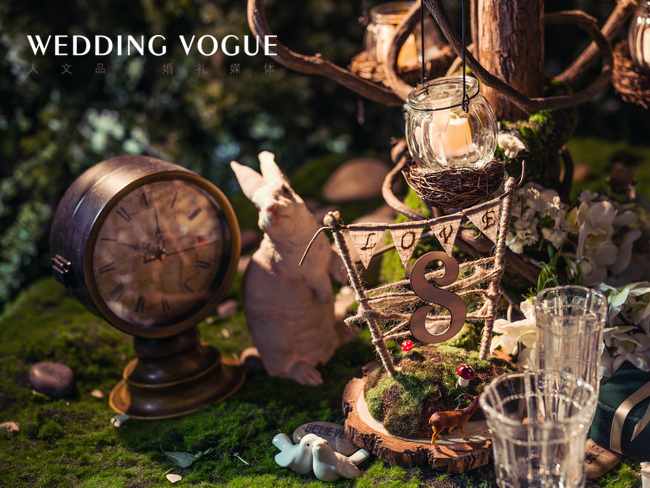 场景布置上,运用了树枝、草坪、花卉、动物等相关元素,婚品与甜品的设计来自于很有爱MeltingCandy与有意思蛋糕UESbakery, 蘑菇、动物等造型从细节上呼应了整体风格,同样体现了森系的自然元素,呈现出了一派鲜活生动的自然森林景象。这或许为很多亲睐森系风的准新人们带来更多的婚礼创意灵感,无论在户外还是室内,一场完美的森系婚礼可以得以很好的实现。