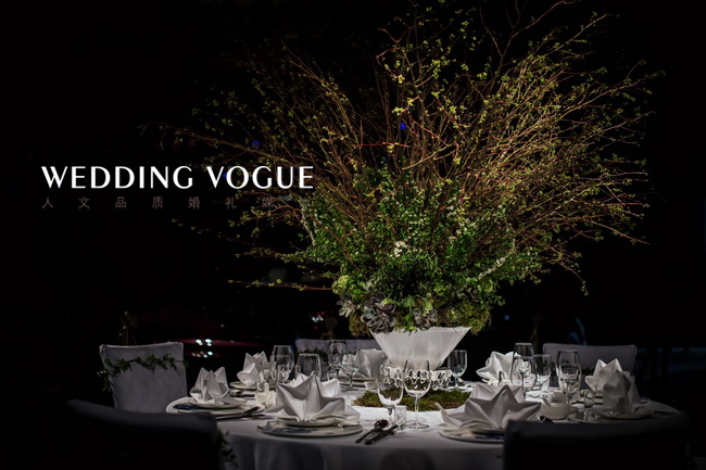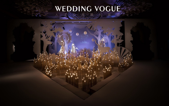 大面积镂空剪纸背景、与婚纱相呼应的蕾丝纹理装饰、散发生命光感的芦苇灯、几何艺术T台,整个秀场是Art Deco婚礼设计与现代婚尚相结合的产物,萝亚V-CLUB高端宴会策划团队通过创新诠释出此般简约灵动的婚礼境界。