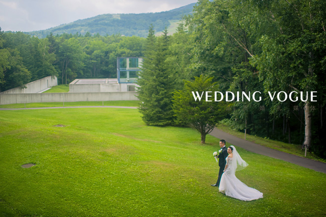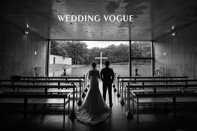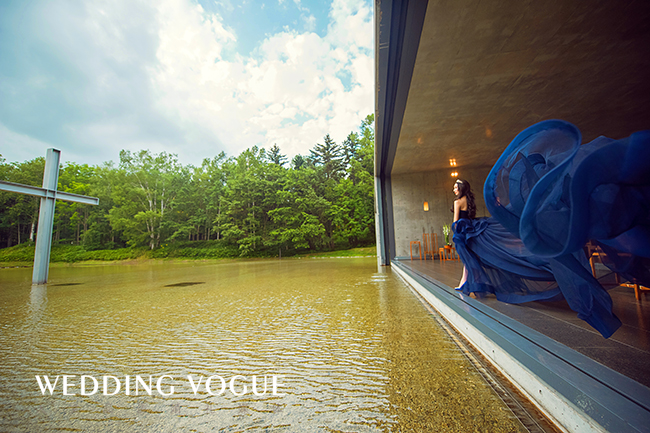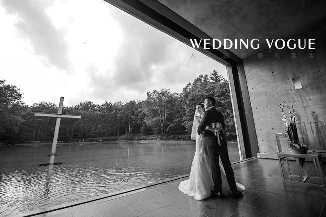 婚礼的场地非常特别,是由世界著名建筑家安藤忠雄所设计,以“与自然共生”为主题的——水之教堂。CC说她从小就梦想能在教堂里举行婚礼, 在牧师神圣而庄严的的证婚仪式中,与另一半深情的交换结婚誓言。新郎Tim是一名虔诚的基督徒,两位新人不约而同的选择了教堂作为他们婚礼的场地。 教堂周围的白桦林,北海道的蓝天白云都倒映在水面上,让来宾们感受着北海道的清风,听着湖水的潺潺声,远处莺鹂的歌唱,犹如大自然送来的赞美,祝福着新人。