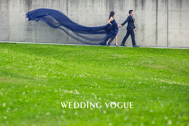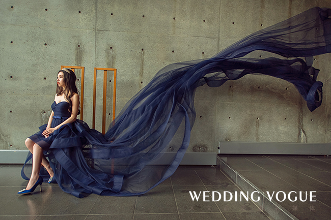 做为婚纱品牌创办人的CC,在婚纱礼服的设计与选择上有独到的见解。她的这件深蓝色礼服的设计理念源于“爱比纱长”的幸福寓意。西方婚礼中新娘会在造型中加入“something blue”的元素,代表幸福和好运。她为自己设计了这件拖尾足有3米长的深蓝色礼服,象征着她和Tim的爱情“情比金坚,爱比纱长”。