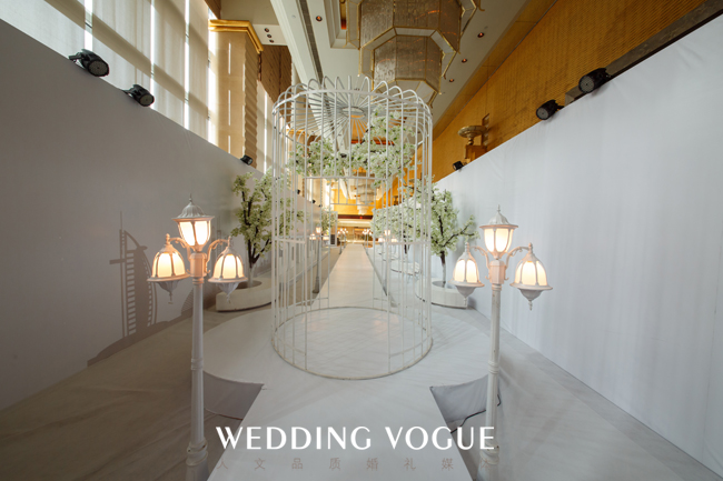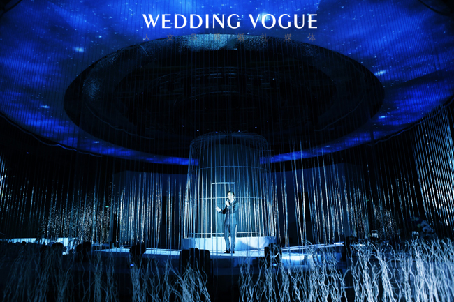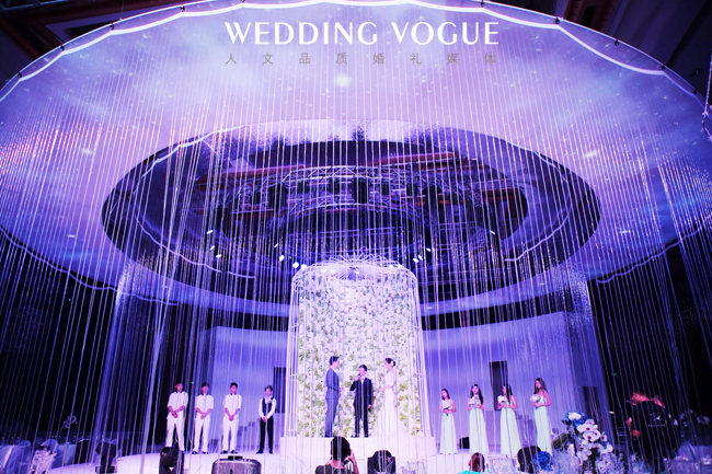 整个婚礼秀将传统独立的婚纱礼服走秀融合进去,从一对伴郎伴娘的起舞引出绝美的婚纱和男士礼服,让刚步入婚姻的幸福美好体现到极致,上半部分基本围绕这这样的情绪展开。随之是牢笼转过来后花厅内的清新仪式,体现从恋爱走入婚姻的快乐。这个时候人们对婚姻的向往是单纯的,并不掺杂过多的杂质,甚至只要有爱就行。中间部分用比较迷幻的手法借用大量重叠的誓言音频和象征轮回超脱的梵音,结合灯光舞美和全息,寓意着时光的更迭和世事心态的变迁。然后笼子又转到了花亭那一面,仿佛回到了新婚仪式的瞬间,只是容颜不再。一对老人诉说了他们40多年真实的婚姻、家庭的心路历程,并郑重的许下了来生再续缘的承诺。让现场观礼的新人们感概不已。