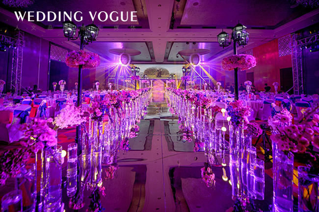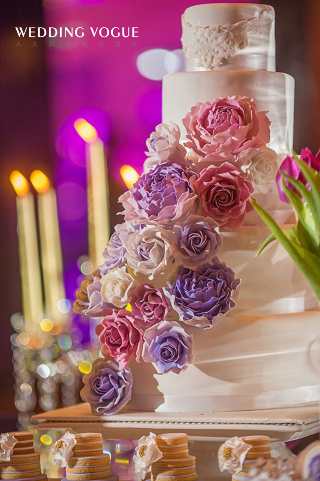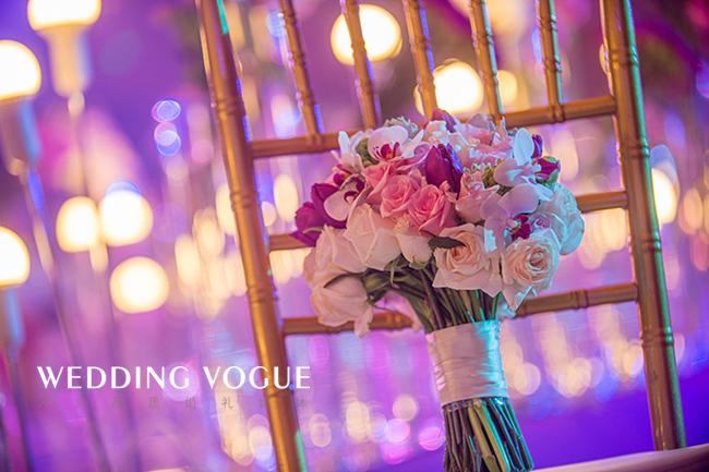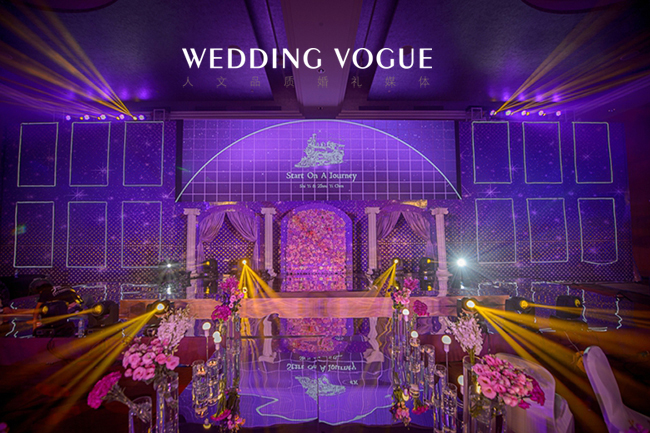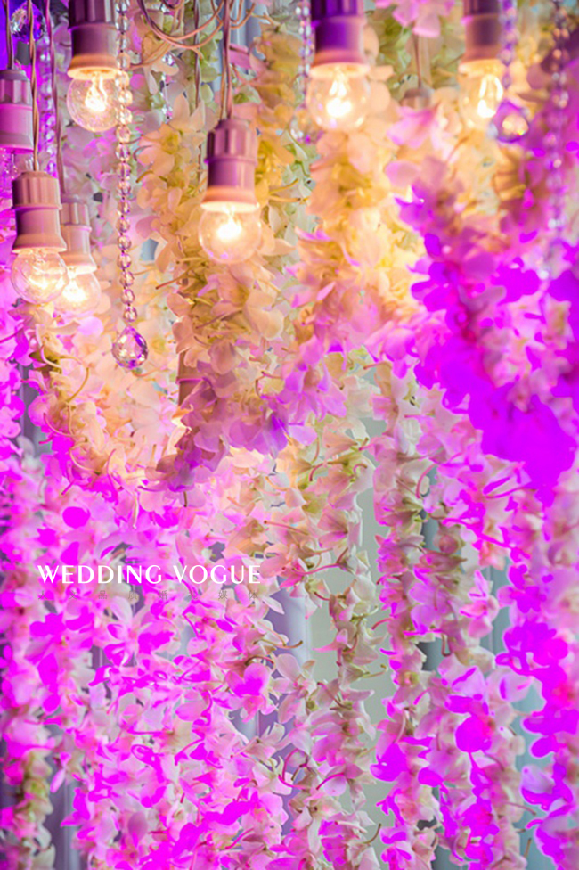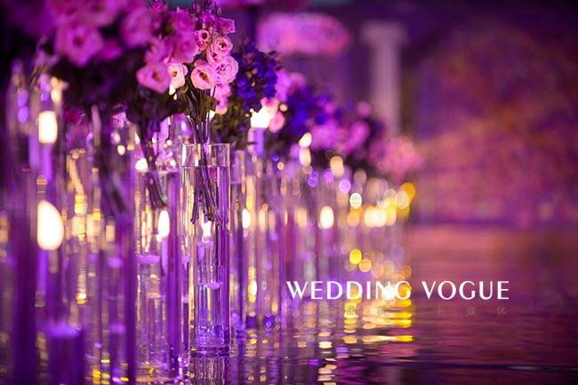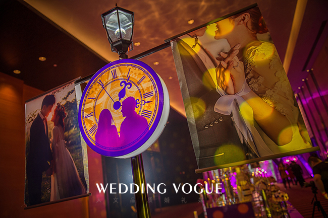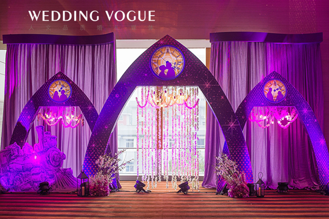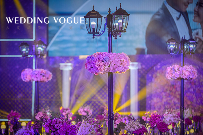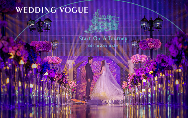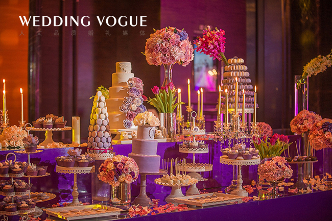 车站的元素在这场婚礼的体现尤为突出,在迎宾区和舞台的两侧都设立了火车站台上特有的路灯。铁艺的精致路灯搭配柔美的鲜花,别显韵致情调。在舞台上6米高的背景墙十分引人注目,由小灯泡所组成的灯带,代表着列车的轨道和行驶经过时所带来的光明。同时,甜品桌也是这场婚礼的一个亮点,设计师专门为这场婚礼设计了一个双层的不规则甜品桌。水晶烛台、银白色的烛光、随意散落的花瓣,设计精美的甜品桌使整场婚礼更具有甜蜜和浪漫的氛围。