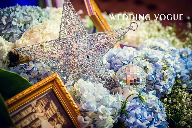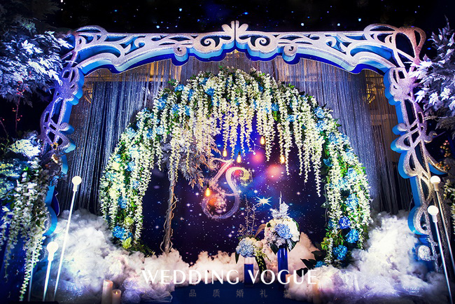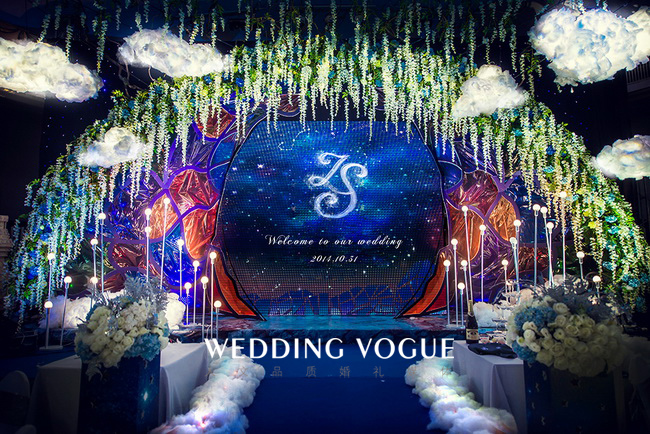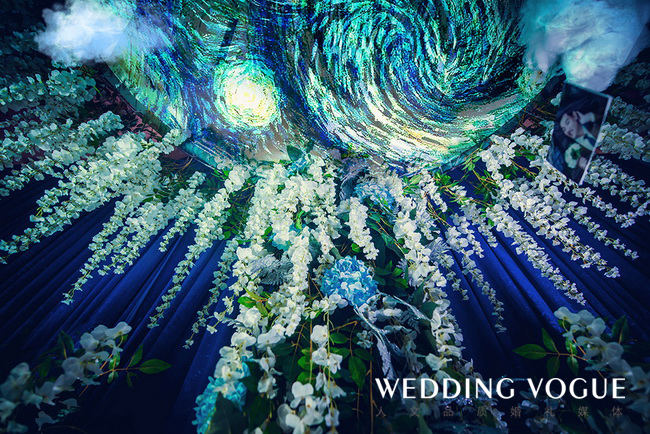在展示区的设计上也运用到了穹顶的概念,在弧形的背景墙上使用了梵高著名的画作《星空》为主画面,并用亚克力管将小米灯都穿在了一起,打造好似冰棱柱的质感,再结合漂浮着的云朵,浪漫温馨的紫藤花串,呈现出一种仿佛置身于天空之城的奇幻效果。在签到的桌面上设计师也做了特殊的处理,打造出星球上石头般的肌理感,并在桌面凹陷的部分放置了些许亮钻与水晶石,再加上周围灯光的点缀,营造出星际之中浩瀚的感觉。这场婚礼中的多媒体互动也受到了来宾们的广泛好评,只要扫二维码并发送对新人的祝福,就可以马上在LED屏幕上实时滚动显示出来。这么好玩的多媒体互动,准新人们不妨也运用到自己的婚礼中来。