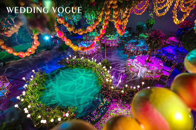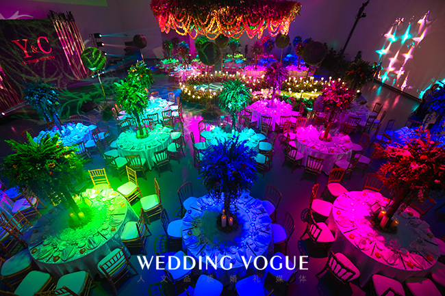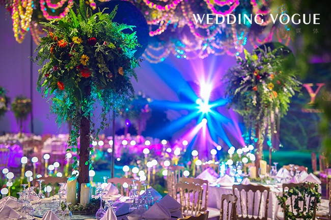 由于馆内的层高比较高,为了避免过于单一的视觉感官,诺丁山将每一桌的桌花都设计成一颗颗很高的树,再运用不同的灯光照射下来,光影交错,折射出不同的色彩,也增加了整个场景的层次感和摩登气息。