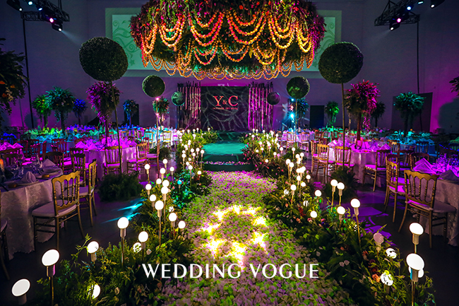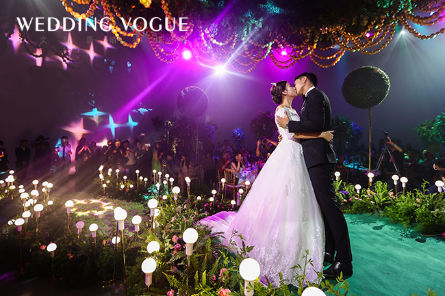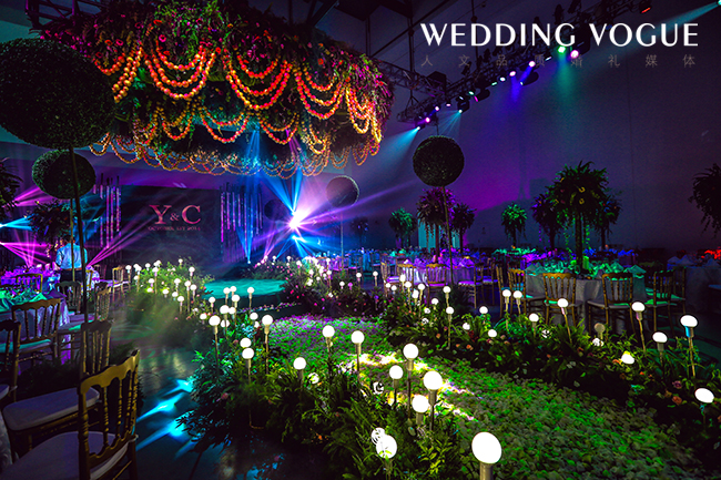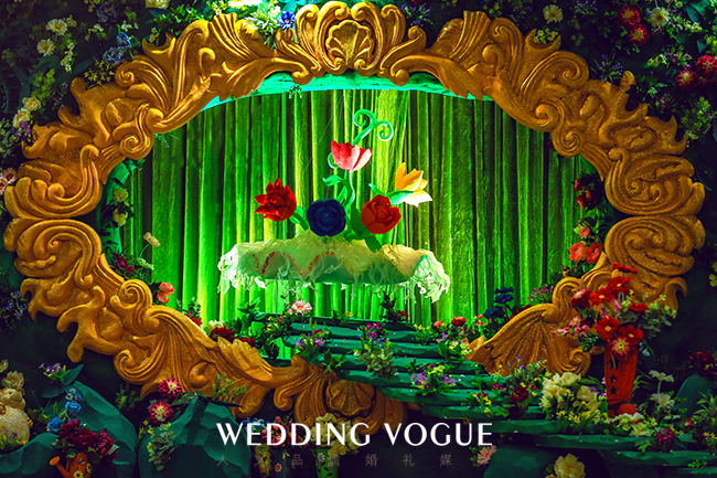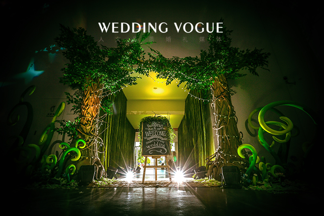 顺着铺满花瓣的小路,来到舞台的中央,它是由几十条金色珍珠串起的吊顶。让来宾置身其中,仿佛进入真正的秘密森林,铺面的花香和满眼的绿色。在仪式区的背景墙上,展现的是新人的姓氏字母logo,在浪漫的氛围中又见简洁大气的一面。