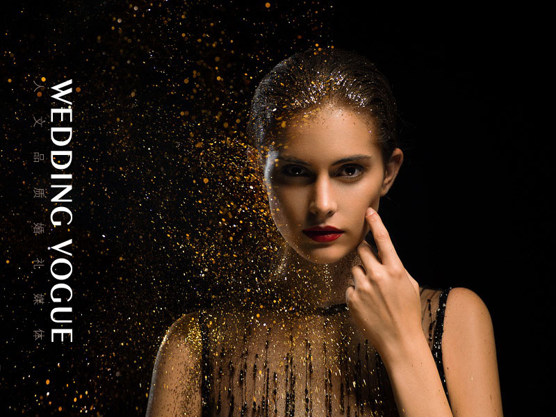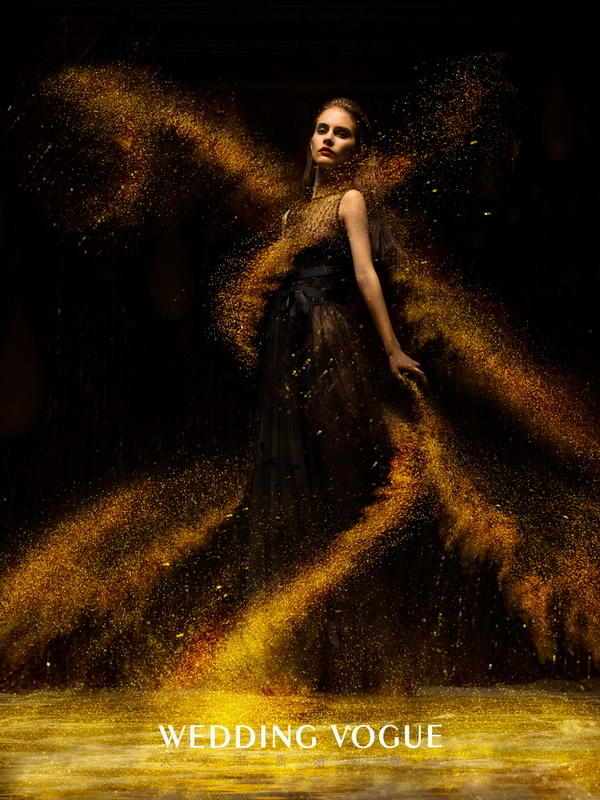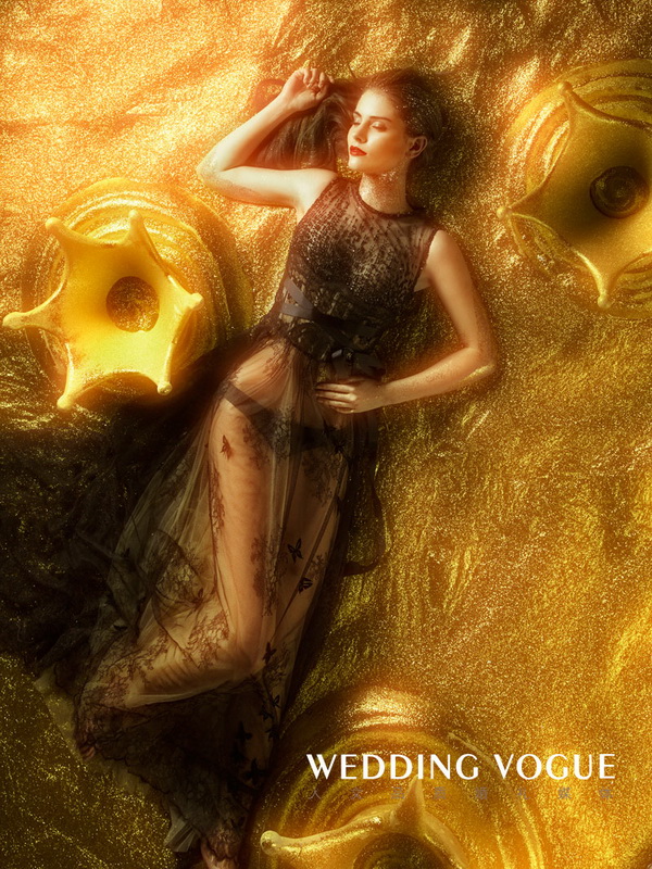 此次风尚大片在婚纱的设计上所凸显的是时尚现代感的风格。MElody曼莉婚纱为了此次大片的拍摄专程定制了四套婚纱。其中三件婚纱运用了金色和与主题相契合的花朵与树枝的元素。而第四件婚纱所使用的是和金色相对撞的黑色,形成了一个鲜明的对比,营造出了一种神秘魅惑的感觉。在婚纱的制作工艺上,使用了精致的法国进口蕾丝面料,和手工刺绣、钉珠的繁复工艺,以展现出婚纱高级定制的极致华美。