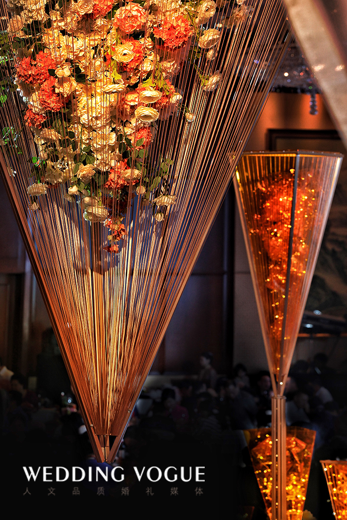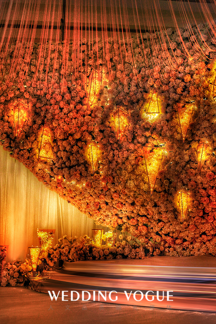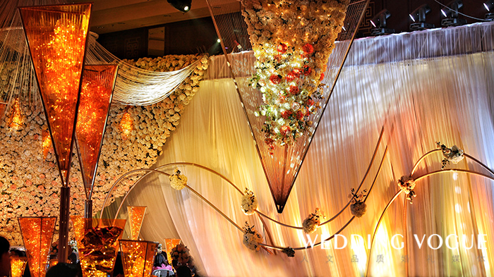 Caleb RAI:这场设计的构思很多来源我对新人的了解,他们似乎彼此之间有一种无形的力量在化解一切,感情总是稳定得坚不可摧。因而在策划过程中有很多问题出现,但也能很快地被解决。异形的舞台,与大量空中的悬挂物,让施工变得无比困难,而确定方案的时间,距离婚礼时间又相当的短,因而选择材料上,我们采用更易定型,更轻薄的材料,去制作道具,让时间和安全系数都得到保证。