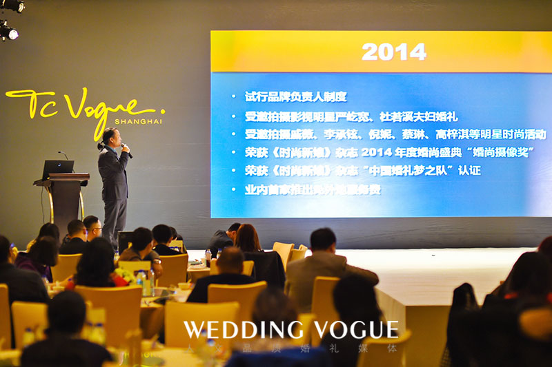 2014年12月23日,由业内八大强势品牌TCVogue汤池印象、Your Light舞美灯光创意、TopBridal国际婚纱奢品荟、LaGrace蕾丝影像、Rui'Z睿製高端男装定制、CandyMaster糖果大师、Sweeter V薇甜及VCLEANSE维果清联合主办的“尚品尊享,轻资共赢”2015婚礼行业尚品发布会,在上海雅居乐万豪酒店隆重举办。近200位来自各地的婚礼同行齐聚一堂,共同见证了这场精彩纷呈的暖心盛典。