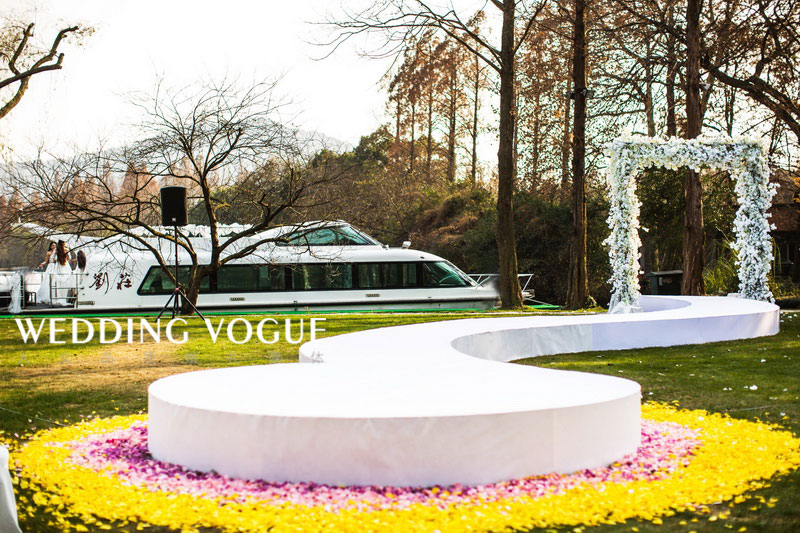 婚礼秀的开场由西湖国宾馆中那一方静美的湖面开始,一艘精美的游艇载着身披嫁衣的美丽新娘从西湖的中心向草坪仪式区渐渐驶来。T台的设计与码头相连接,使新娘们可以直接踏上这条通往幸福的道路,将自己最美的一面呈现给在场的来宾。非常值得一提的是麦瑞在这场婚礼秀中并没有聘请专业的模特进行婚纱的走秀。而是邀请到了真实的麦瑞准新娘们来展示这些华美的婚纱。在麦瑞婚礼的创始人小乐看来只有真实的新娘才能表现出穿上美丽婚纱那一刻的幸福,眼神中的那份欢喜之情是无法演绎而得的。