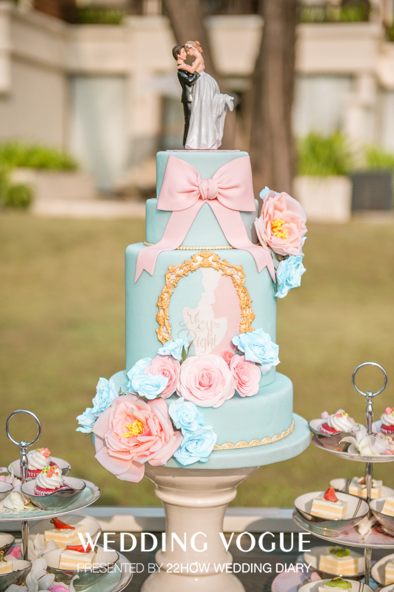 那段时间见了很多婚礼团队,也看了很多资料,但只有她们让我感到安心。我们定下了“对先生与对小姐”的主题,然后订下超级法国玛丽皇后下午茶的主题色——粉红、粉蓝,他们特别找来我们照片的侧脸,设计了两个彼此凝视的浪漫图案。