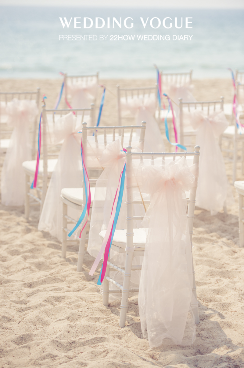 婚礼仪式区设在海景villa前的沙滩上,仪式亭由扎满白粉色玫瑰花的花柱群组成,同时法式花盆分列两旁,花柱顶端的飘纱随风飘荡,与宾客的粉色蝴蝶结椅背纱交相呼应。营造出一种双鱼座女生钟爱的浪漫氛围。