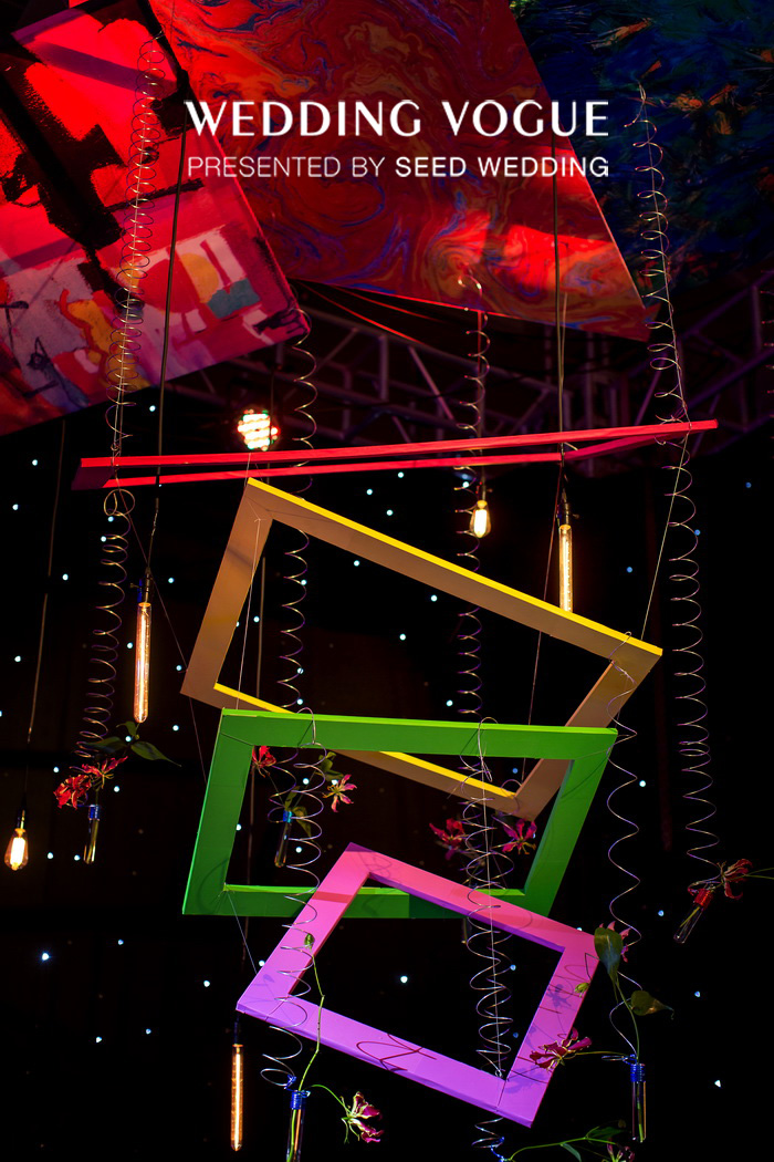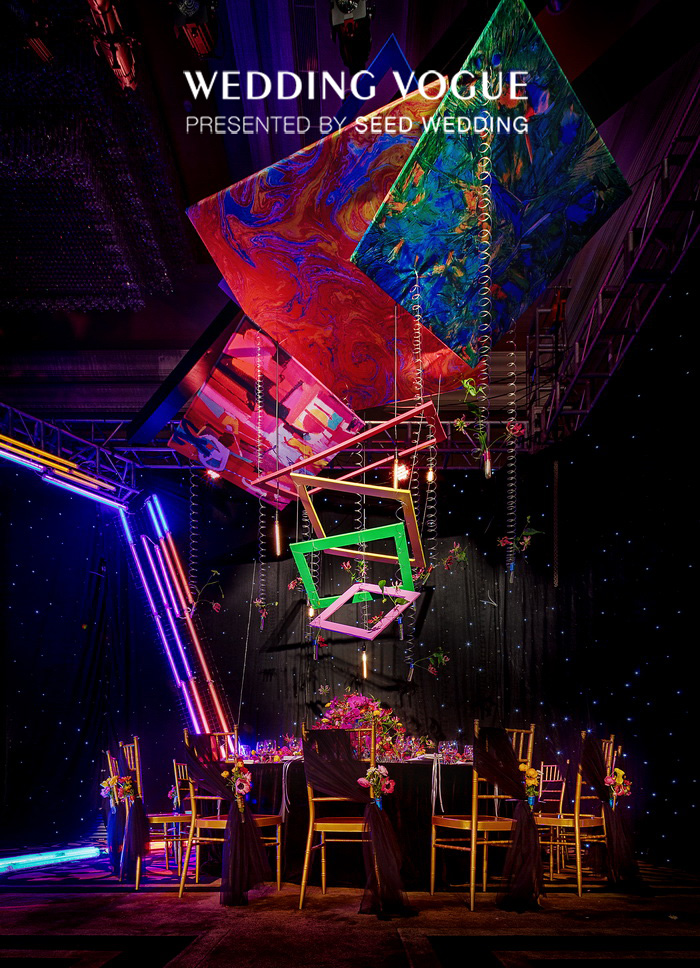 根据主题,现场在色彩的运用上比较大胆,几乎把所有色系都用上了。赤橙黄绿青蓝紫,来体现年轻人眼中看到的世界是缤纷多彩的。同时,在整个宴会设计的布景中,舞台构景也突破了常规,整个舞台设计打破了原有的所谓中心舞台或者偏台的方式,而是选择了一个角落设计的方式,这种设计的好处是,可以将整个宴会厅比较局限的空间进行最大化的利用,可以容纳下最多的人。材质上,也是采用了很多异材质,金属与花卉缠绕的桌花,上方随性垂挂的彩色油画板错落有致,长满灯泡的拱门都成了此次设计的几大亮点。