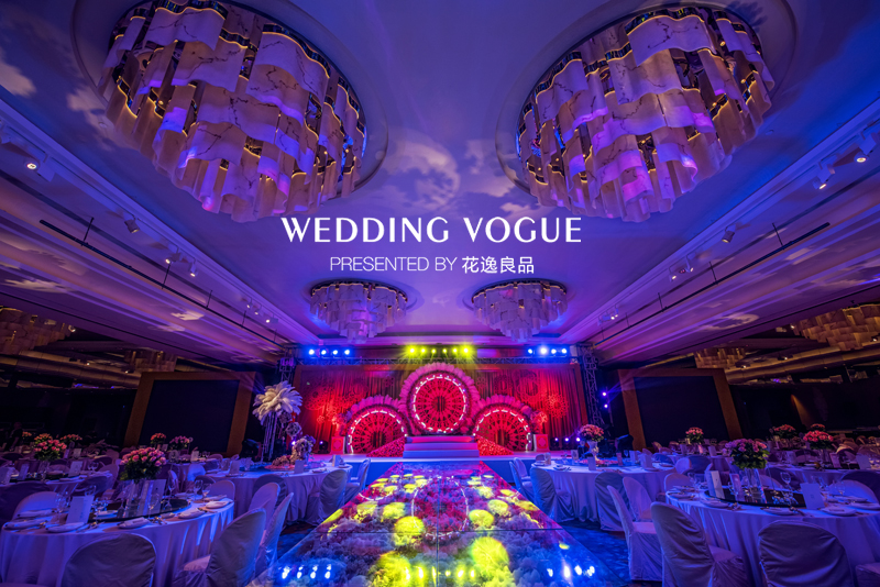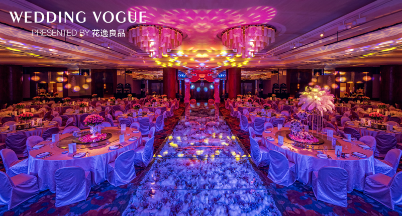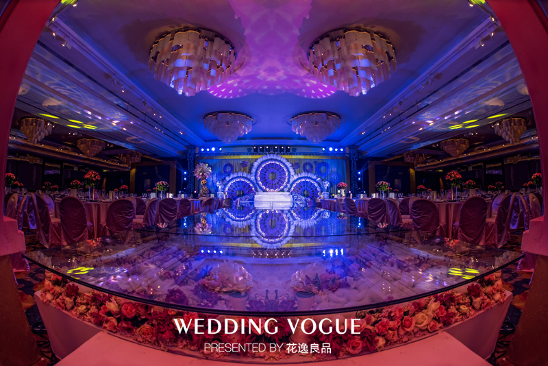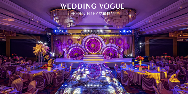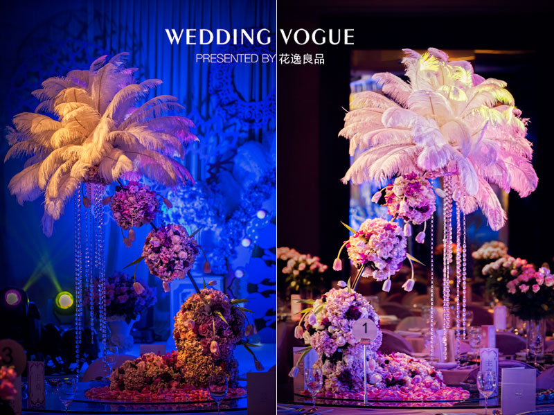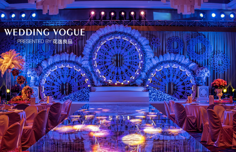 在这场婚里中,万花筒、皇冠以及水晶T台的制作耗费了大量的时间和人力。万花筒制作的时间较长,需要把这些PVC雕刻板一块一块拼接起来,立在舞台上,因为万花筒纹样复杂,细小部件众多,所以拼组起来极费工时,以及周围一圈的羽毛,需要一根根拼起来进行粘合。把这些物体呈现出来需要有支撑点,不仅要保证它们的美观,还要考虑牢固性,每一块都要固定好,才能呈现出一个好的效果。水晶T台是需要把T台搭建好后,再在上面铺上一块块的花泥,然后用鲜花在有限的空间插出最美的图样,最后,以水晶玻璃覆面,并且必须保证玻璃稳固,不能有任何缝隙。这场婚礼耗时一天一夜,每个细节花逸良品都精益求精。