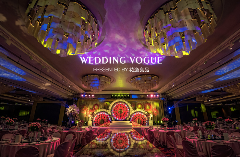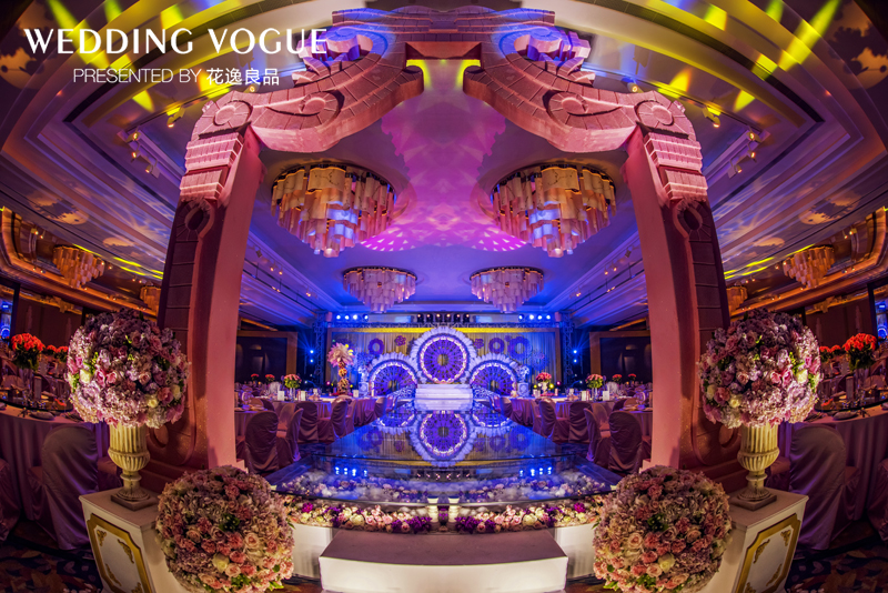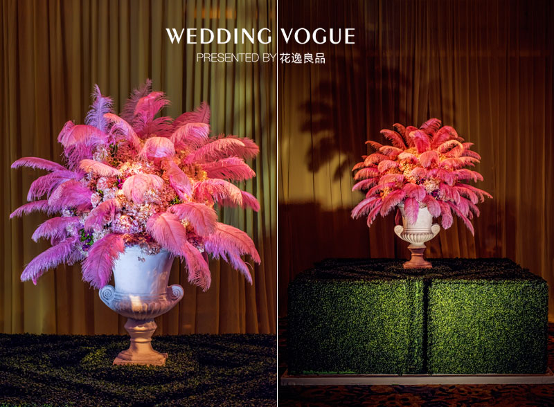 新娘很喜欢羽毛,并且觉得香槟金和粉色不错。策划师在现场的布置上加入了羽毛的元素,整场婚礼也是以香槟金为基调,粉红色系为主。新人因为一首歌《万花瞳》而相识,所以花逸良品把舞台的主背景设计成了一个万花筒的样式,然后用羽毛一片一片粘贴上去,类似于老上海时期那种大舞台摇曳的复古风格。整体方案出来以后,新人很喜欢,现场的效果也得到了各位来宾的好评。