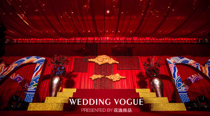为营造出一场大气简洁,且又异于传统意义的中式主题婚礼,花逸良品在此次的设计方案中特意融入了少见的海水江崖和玄子彩墨等传统纹样。海水江崖是源于我国古代的一种祈福图案,俗称“海水江牙”,常饰于古代龙袍和官服下摆。而玄子彩墨则是较多运用在中国古建筑上的一种装饰纹样。在这两个传统图纹的基础上,花逸良品又将它们与祥云相结合,让纹样体现在古代屏风样式的舞台主体上。“因为灯笼,纸扇这类的元素已经反复出现在很多中式主题婚礼上了,所以这次我们想有点创新。经过去年APEC会议的改良创新后,海水江崖除了吉祥好运的传统寓意之外,也被赋予了‘山水相依、守望相护’的美好新意。再加上祥云是我国历代表示吉祥如意的符号,我们这样设计,也是在祝愿新人能相依相偎,白首偕老。”谈及此婚礼的设计思路,花逸良品的策划师如是说道。