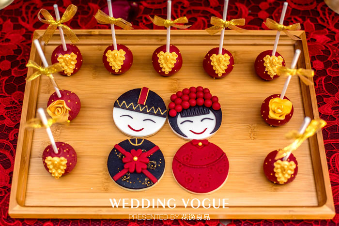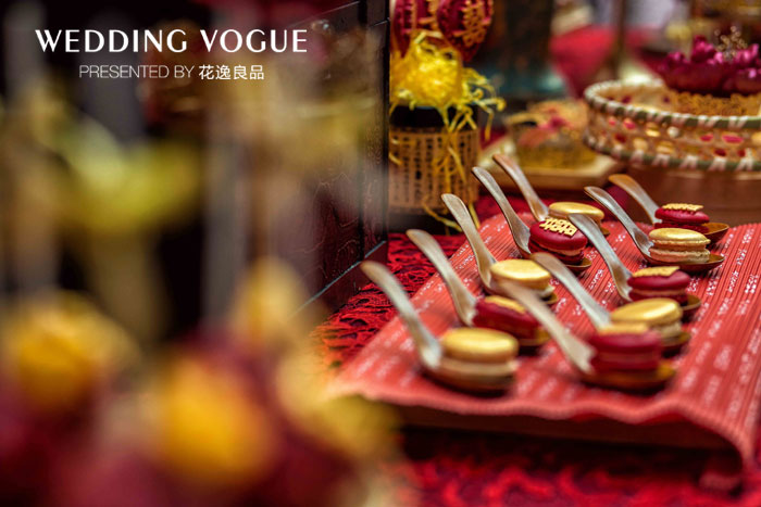 尽管新人都有在美国求学工作的经历,但为了迎合双方父母的喜好,新人最后还是将婚礼主题选定为了中式。为此,花逸良品特意采用了国人都喜爱的中国红做整体基调。布置上搭配金色祥云泡沫雕塑,以及寓意吉祥的海水江崖纹理。主舞台利用木工板做了两组祥云样式的木框,木框上印有红蓝黄白的海水江崖纹理,并让木工以金布包裹,以营造大气的视觉感受。整个主舞台由上至下佩挂着五片屏风的雕刻版,和代表吉祥的祥云泡沫雕塑,而舞台顶部则垂挂着红色的纱幔做装饰。迎宾区以祥云纹理做背景,在大屏风前,以古代新娘头戴的凤冠为雏形,用泡沫雕塑打造了一个巨大的凤冠做迎宾主体,再搭配一定数量的泡沫金球做点缀。甜品区也同样是玄子彩墨纹样及屏风雕刻板搭配的祥云组合。整场婚礼巧妙地将中式元素融入进婚宴的每个角落,是每位宾客一步入婚宴现场便能感受到满满的幸福与喜庆。