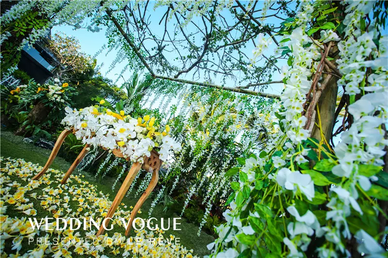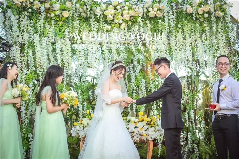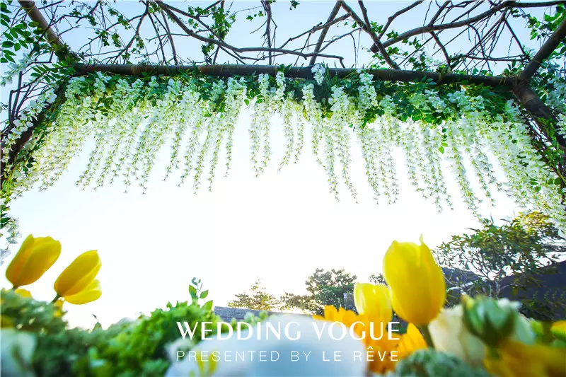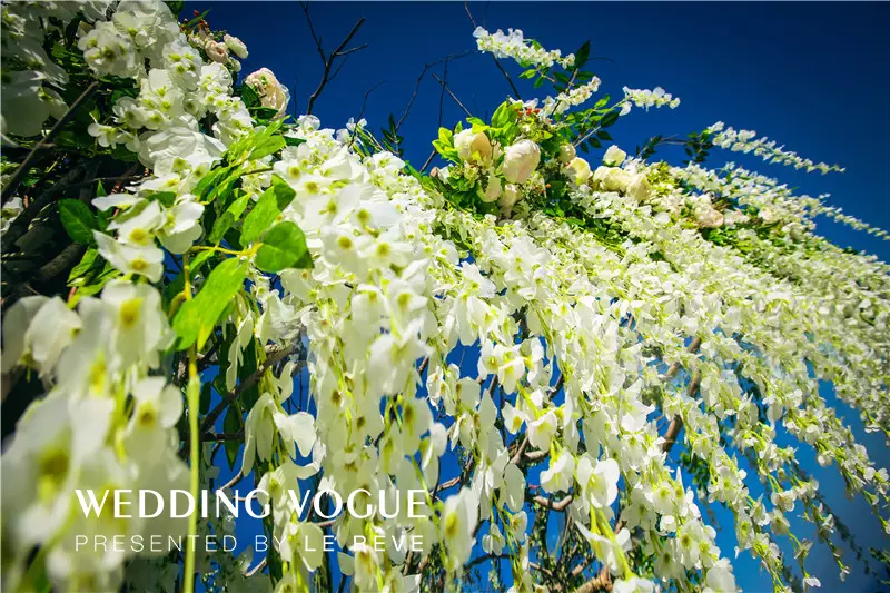 花艺拱门上垂挂的白色花卉,代表着誓言与爱情的纯洁。