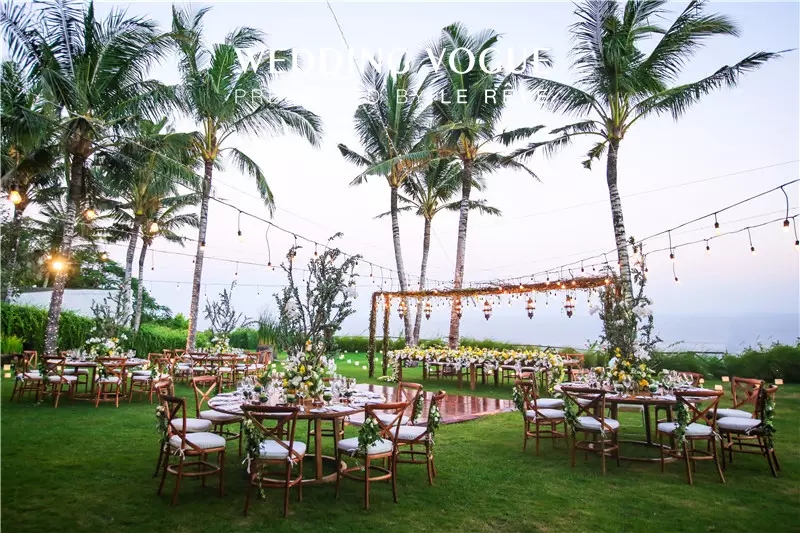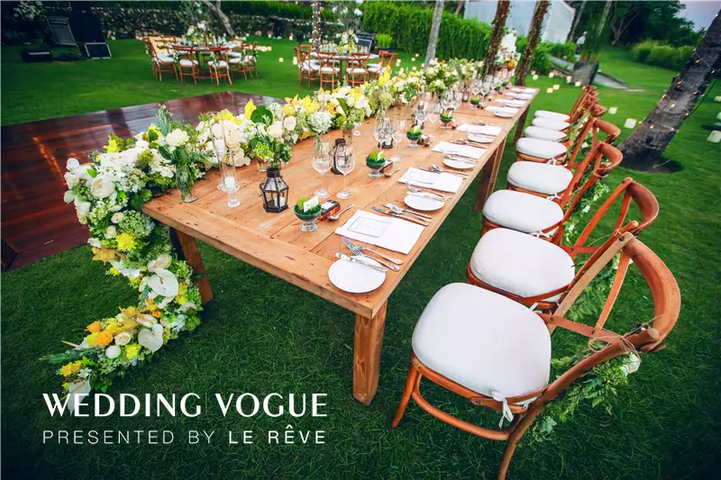 当木质的摆设呈现在婚礼上时,与景色、花卉融合得如此相得益彰,即使透过照片,也能感受到有质朴的幸福在花草原木间穿梭。