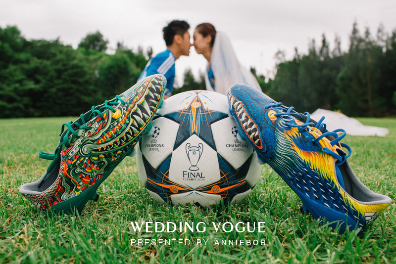 以前Star就曾为CC和自己定制过同款球衣,我们决定找一处漂亮的草坪让CC头戴白纱身着球衣来拍照。限量版球鞋和签名足球也要一起出镜。