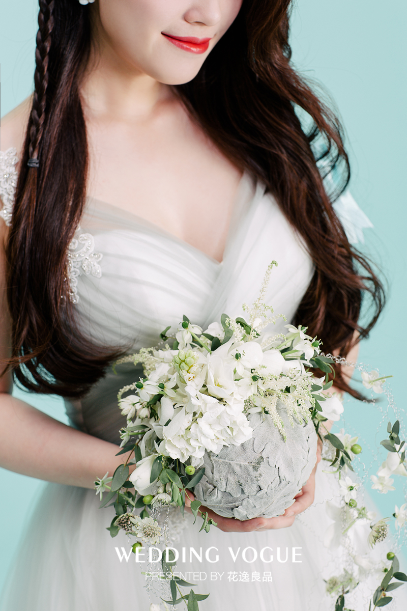在造型上先进行了颠覆,将花束改为手托式的球形,以银叶菊包裹住,寓意爱情的圆圆满满,顶部也运用了比较日式的插花技巧。该作品整体风格偏日系小清新。