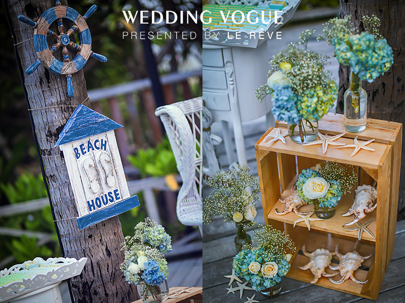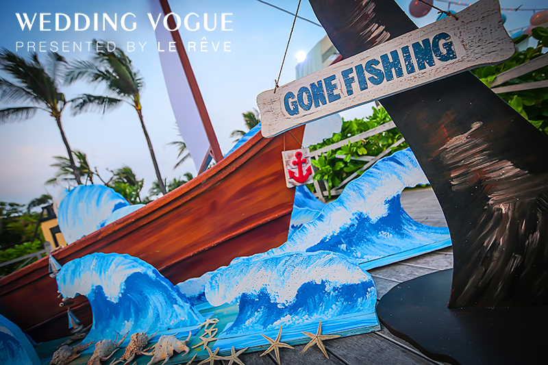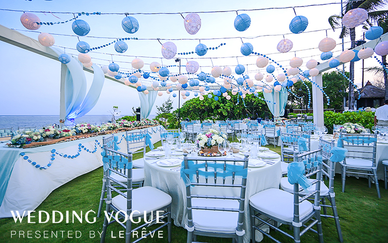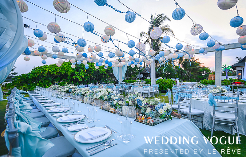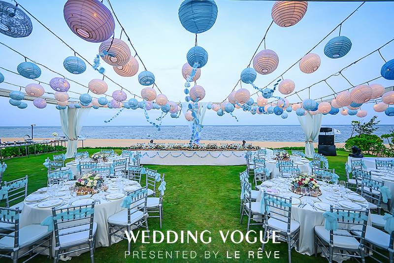 在沙滩上举办的欢迎宴采用了波西米亚风格,以蓝白两色为主色调,加以灯笼与绸缎等元素点缀,与巴厘岛水天一色的迷人景色搭配的恰到好处。清新的布置与细节上的贴心细致的服务,呈现了一个轻松愉快的宴会环境,身穿波西米亚风格的宾客们,在吹拂的微凉海风与洒落的和煦日光中,尽情地享受着海岛婚礼的浪漫与惬意。