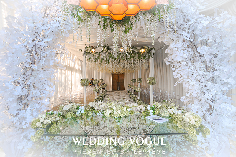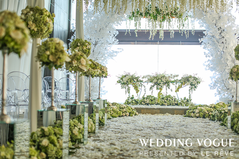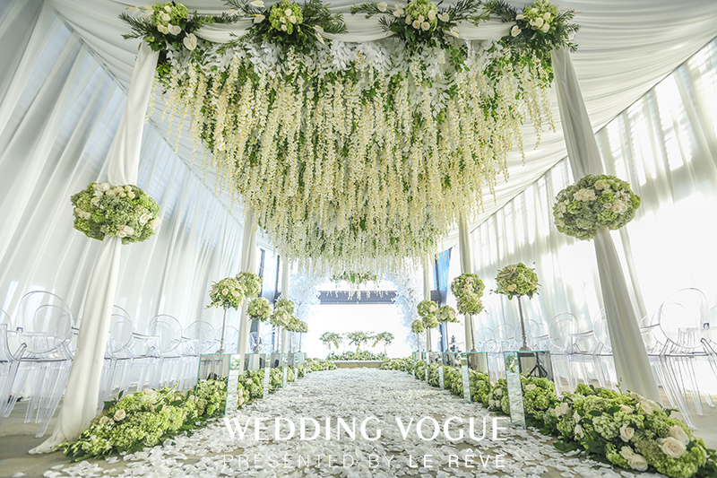 在这个被湛蓝海水围绕着的浪漫教堂中,纯白的轻纱帷幔与花海带来了一场极致的视觉盛宴,同时独具气质的唯美布置也为这场婚礼仪式增添了神圣庄重的气息,家人朋友们一同见证着如花般绽放的爱情。