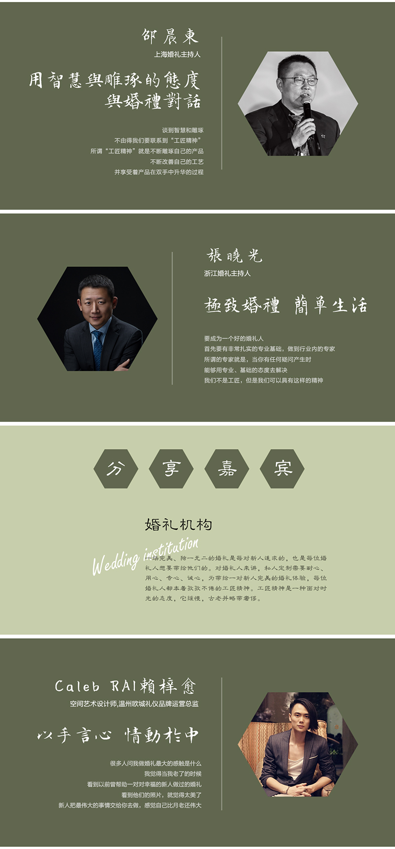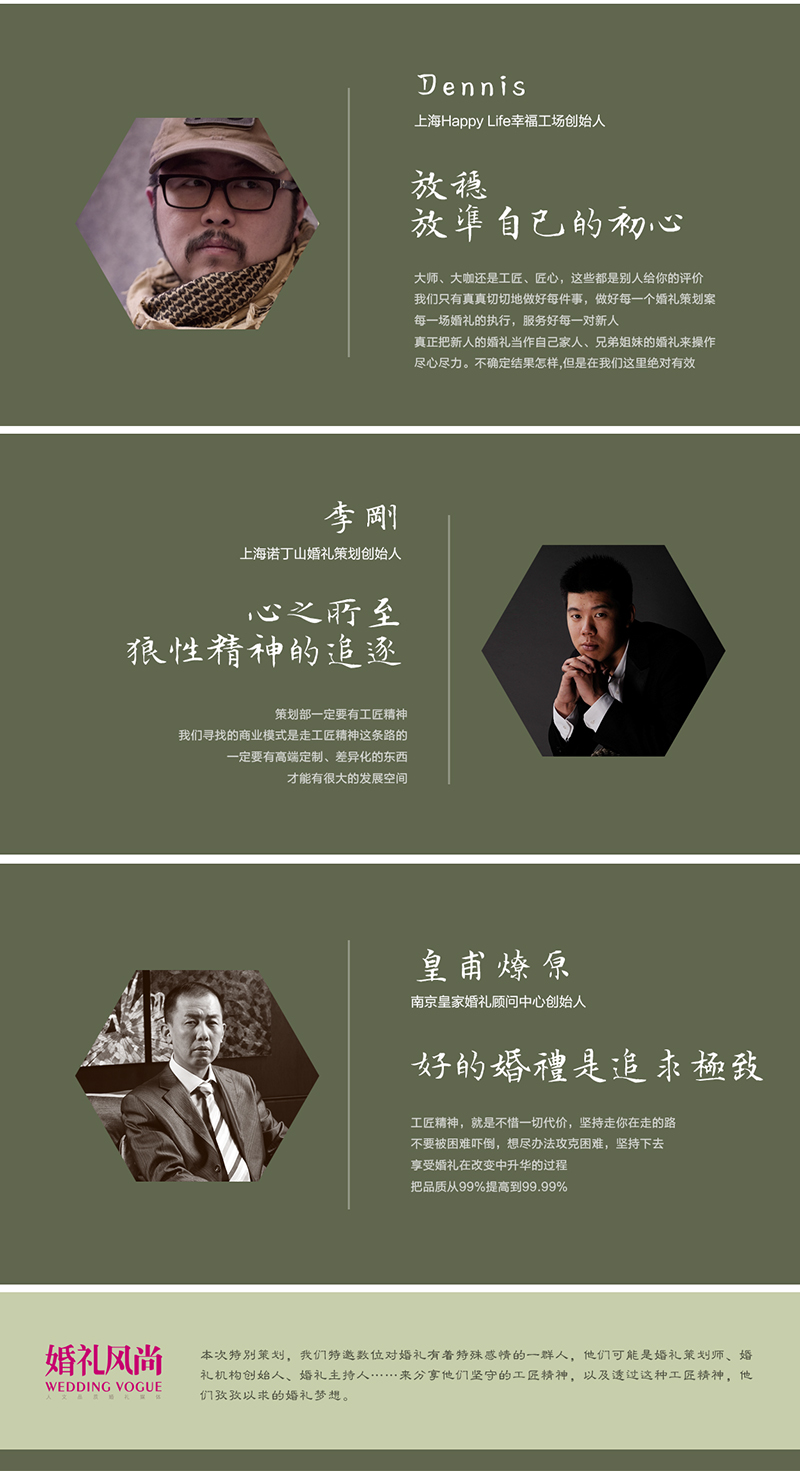 一场完美、独一无二的婚礼是每对新人追求的,也是每位婚礼人想要带给他们的。对婚礼人来讲,私人定制需要耐心、用心、专心、诚心,为带给一对新人完美的婚礼体验,每位婚礼人都本着孜孜不倦的工匠精神。工匠精神是一种面对时光的态度,它缓慢,古老并略带奢侈。本次特别策划,我们特邀数位对婚礼有着特殊感情的一群人,他们可能是婚礼策划师、婚礼机构创始人、婚礼主持人……来分享他们坚守的工匠精神,以及透过这种工匠精神,他们孜孜以求的婚礼梦想。