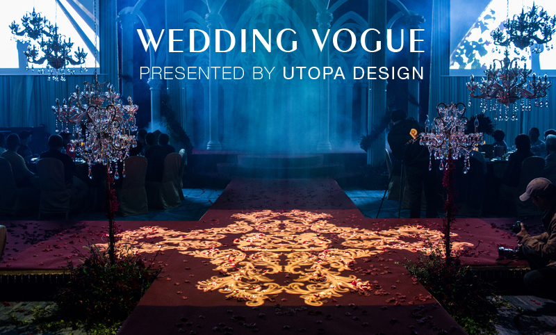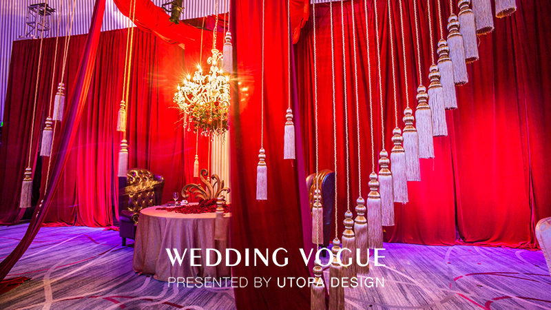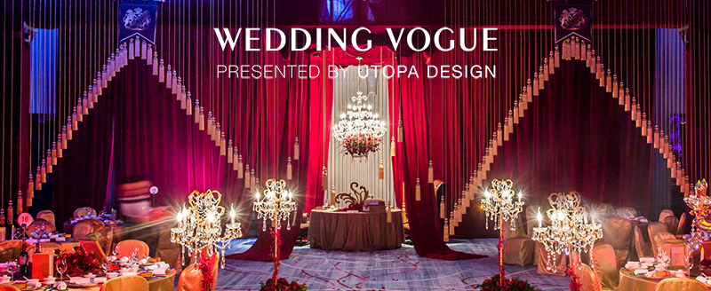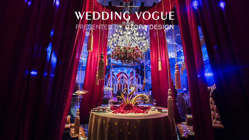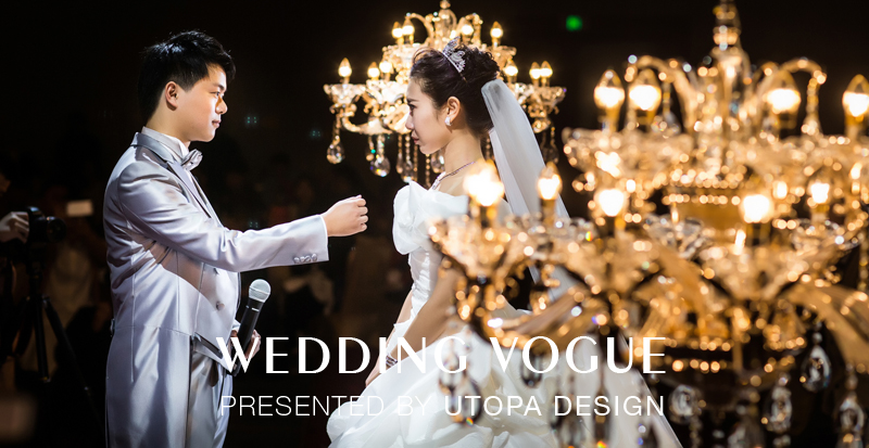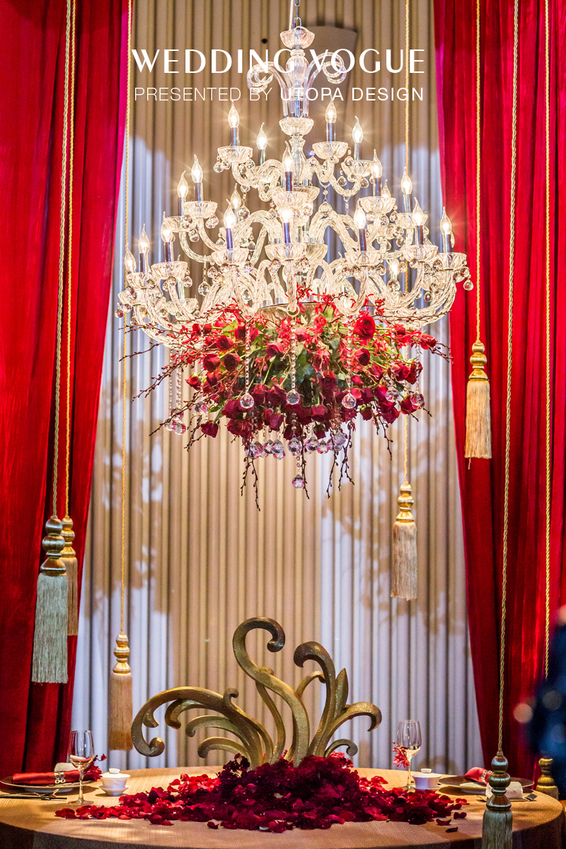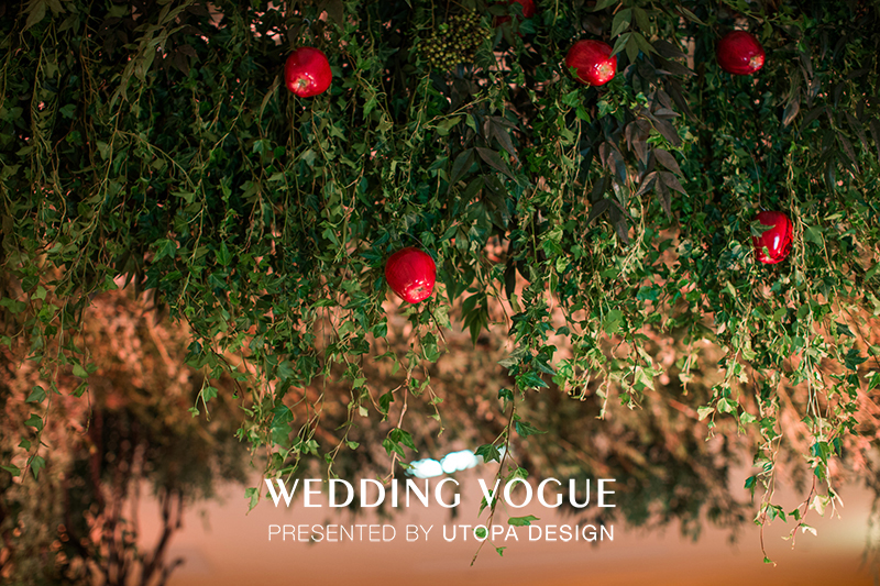 场景设计将宴会厅外划分出了三个层次,从一道欧式大门到欧式原木甜品桌,最后进入欧式的林间花园。每进入一个婚礼区域,宾客将在循序渐进的设计中融入欧洲中世纪花园的氛围。在宴会厅入口处,结合上海中心本身的环形圆柱,设计成时间轮轴,来展现这对新人的甜蜜瞬间。