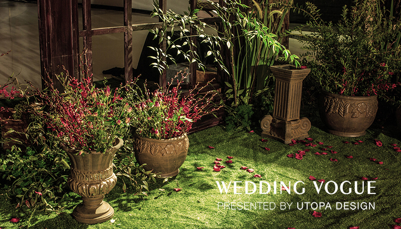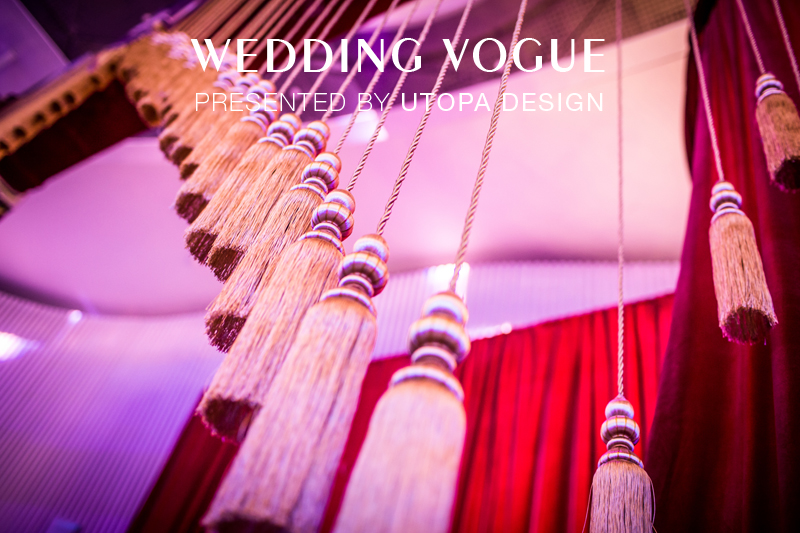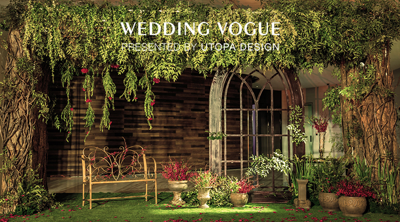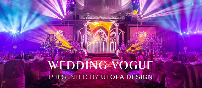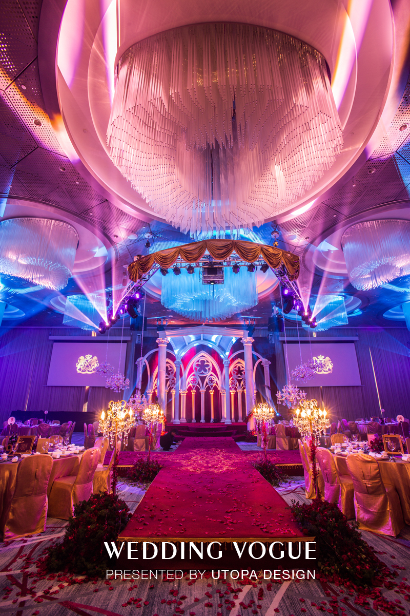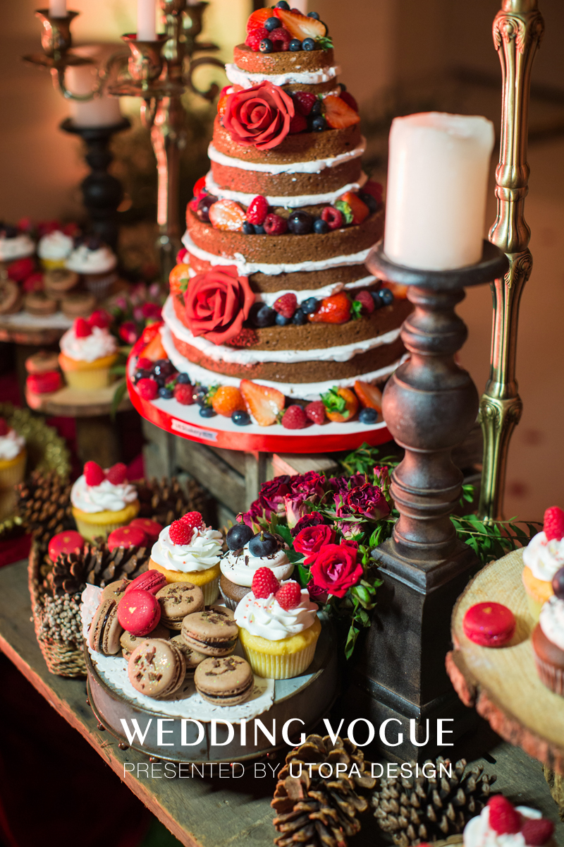 场景设计将宴会厅外划分出了三个层次,从一道欧式大门到欧式原木甜品桌,最后进入欧式的林间花园。每进入一个婚礼区域,宾客将在循序渐进的设计中融入欧洲中世纪花园的氛围。在宴会厅入口处,结合上海中心本身的环形圆柱,设计成时间轮轴,来展现这对新人的甜蜜瞬间。