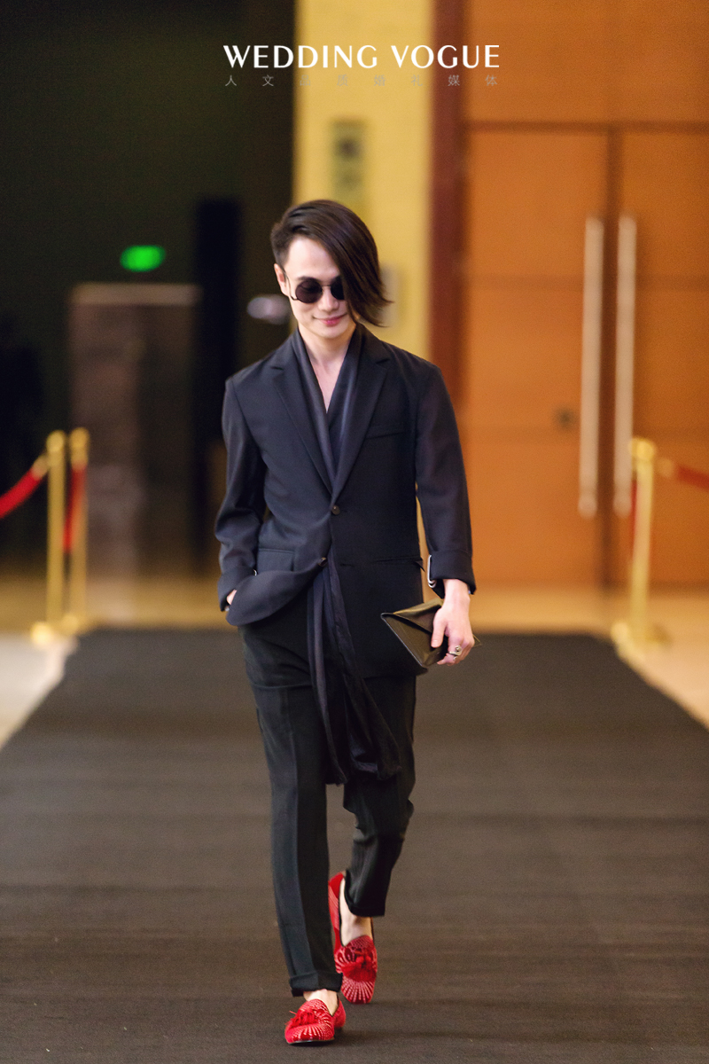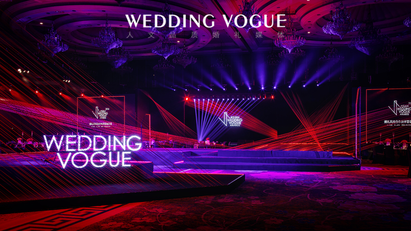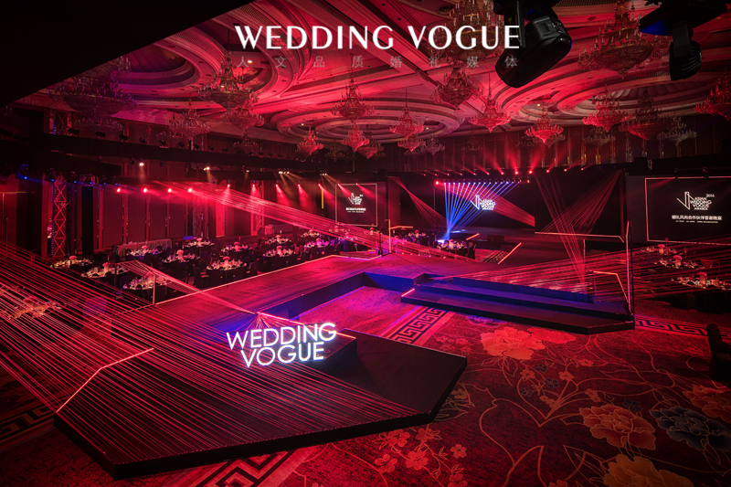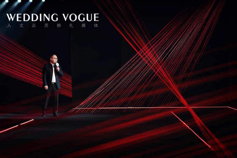 作为本次年度答谢晚宴的特邀设计师,国际艺术空间设计师Caleb Rai赖梓愈在晚宴现场以“WeddingVogue”的logo主体为起点,通过点、线、面相互交错融合的艺术表达形式,赋予了线条的灵活动态感。而收放自如的螺旋形线条,既紧扣晚宴主题“回归”,亦更象征着婚礼风尚张弛有度的格局属性。而蜀地红与高级黑的色彩搭配,则点题火辣蜀都的代表色彩,通过低调的黑色系存托,让整个宴会现场更具格调感和精致性。