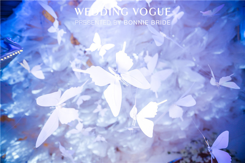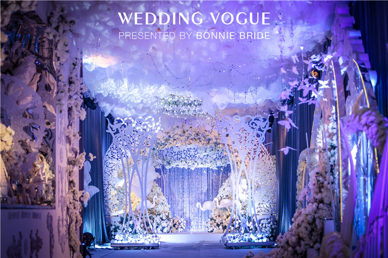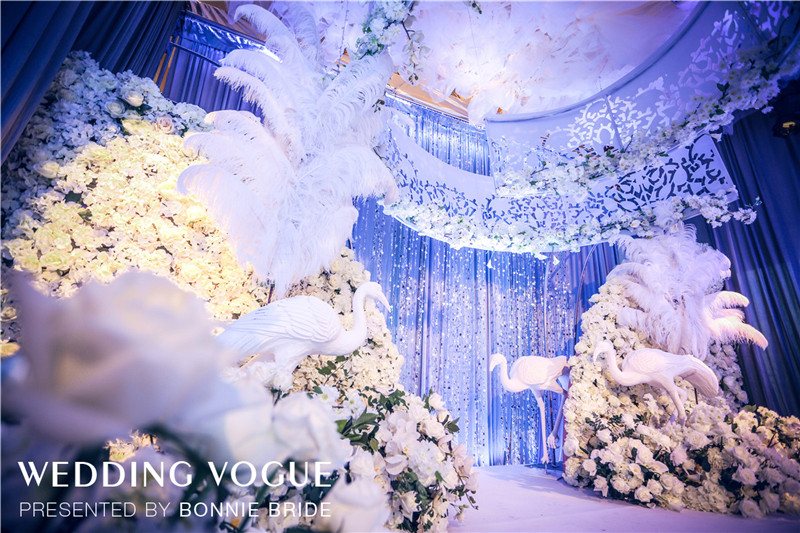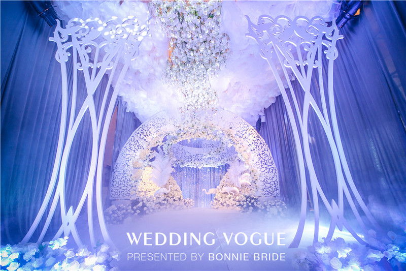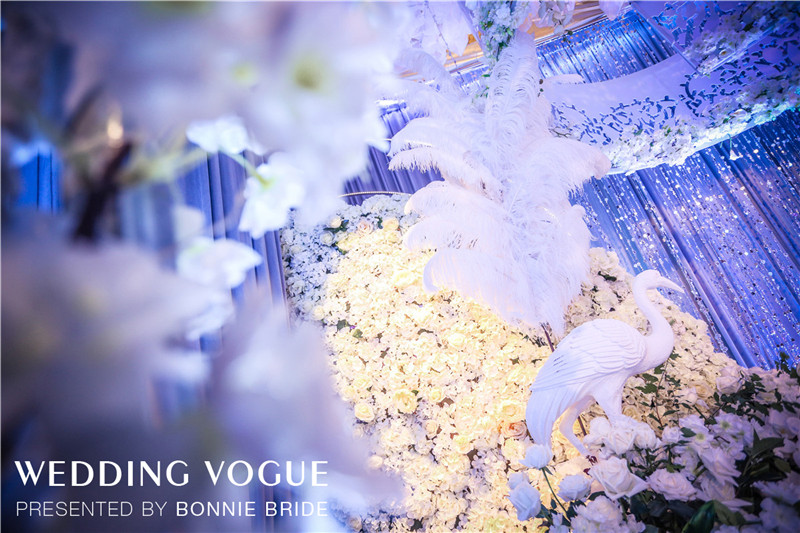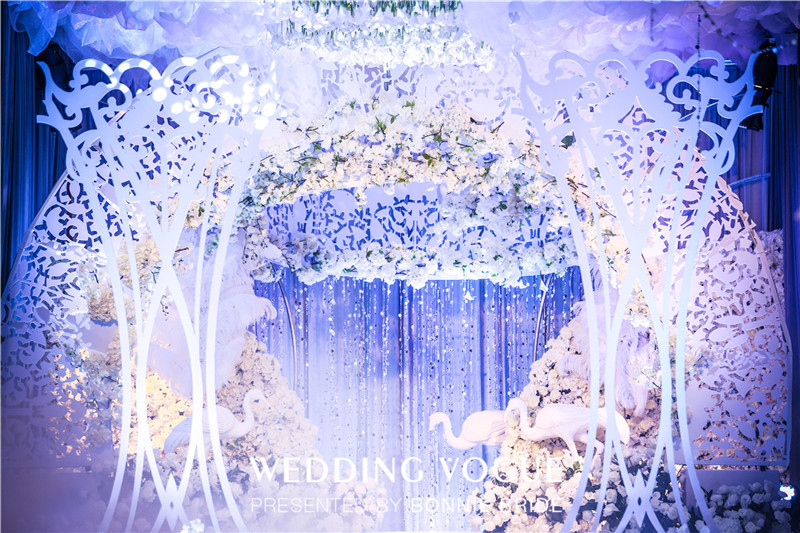 伯妮婚礼策划机构依据新人的想法,用镂空雕塑来打造了宫殿的概念,突显其繁复而简单的风格。迎宾区采用铁艺蕾丝的元素,将精致与坚硬完美结合。在细节上,为了迎合仙境的感觉,伯妮新娘婚礼策划机构加入了一些小而美的元素,比如水鸟、蝴蝶、羽毛等等。相对于传统的主桌,选用西式的长桌来搭配整体格调,更是多了几分冰冷和高雅。