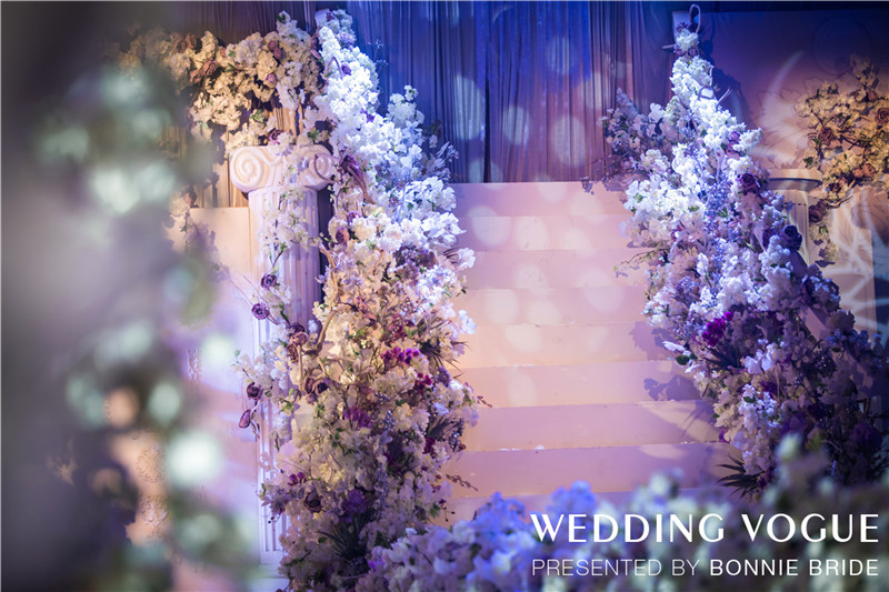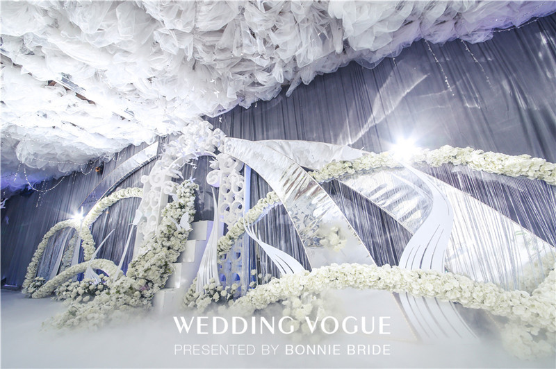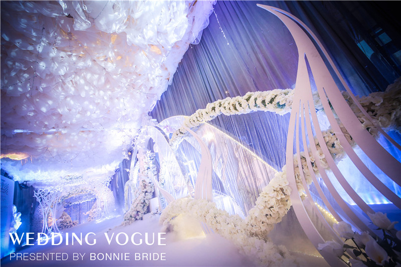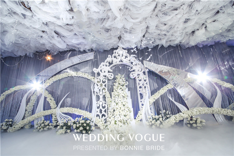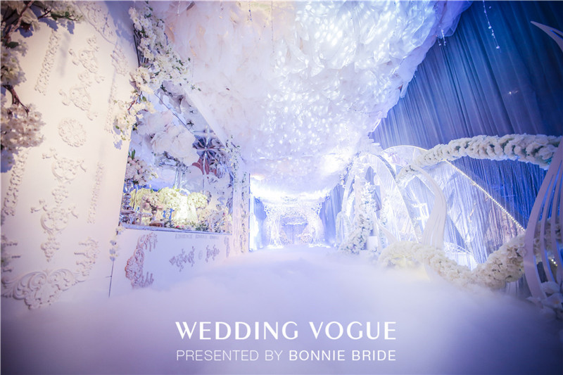在婚礼最关键的仪式台和过道部分,伯妮新娘婚礼策划机构一律使用了大量的白色系鲜花,配合罗马柱和用纱打造的云层效果,宛如一个真实的仙境,与迎宾区的硬朗材质相映成趣,将整个现场变成了一个“冷酷仙境”。
