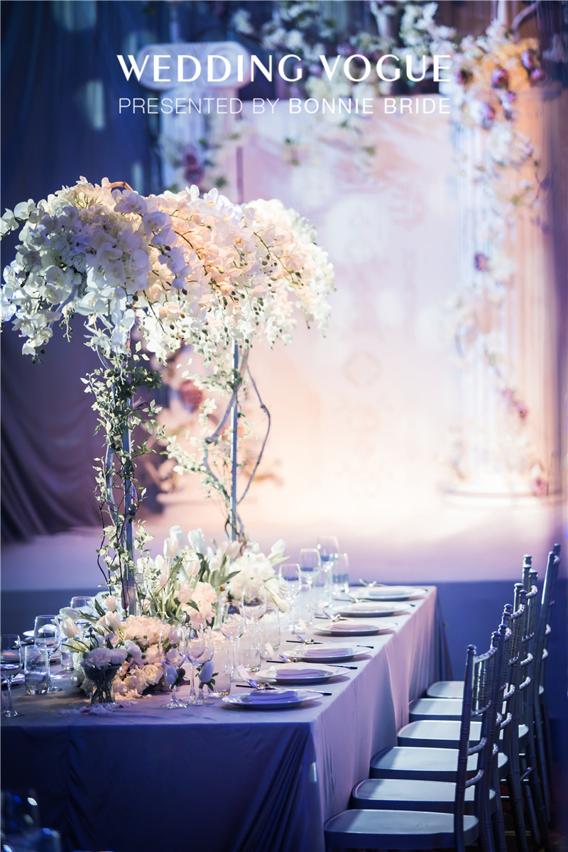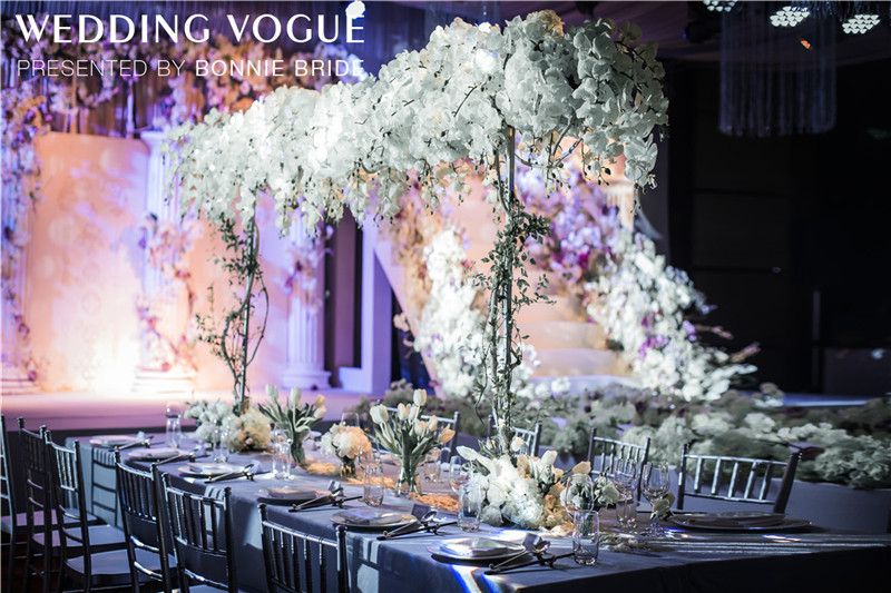 婚礼的主题是由新娘和新郎商量而定的,新娘喜欢花、白色、仙境,而新郎喜欢冷色调的灰、干净利落。最终,这场婚礼以白、灰的整体色调为主,定名为《Chateau de Versailles》(凡尔赛宫),象征着优雅、圣洁。整体布置上则希望有仙境的感觉却又不落俗套。