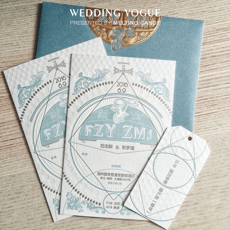 婚礼纸品由很有爱实力担当,整体运用letterpress的复古印刷工艺,菱形为本场婚礼的重要元素,框出了请帖轮廓;两人的姓名全拼FZY&ZMJ是本次婚礼的LOGO,周围以欧式花纹与金色菱形点缀,中间印有标志性的侧面骑士头像,风格清新却不失考究。