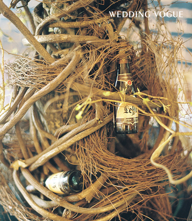 因为一个人,恋上一个地方,具有历史底蕴的建筑,即使岁月风吹雨打也依旧历久弥新,也许很多年后,Brandy和婳婳再来到这个地方,带着他们的孩子,重温这个美好的下午,这段美好的记忆。森系的风格搭配啤酒的元素,像是一次野餐的party,啤酒瓶盖拼成的人像画,惊异于巧夺天工的美,童话里秘密花园的入口,期待着不一样的亲身体验,背景里的喷泉使这一切静物突然生动起来,如同和水柱一起高高低低,起起伏伏,阳光、音乐、啤酒、喷泉和草地,能体会到Brandy对婳婳的宠爱和了解,一个见到啤酒就晕的人为心爱的女子举办了啤酒狂欢的婚礼,爱屋及乌的感动,让这个下午变的无比温馨,好时光就要做幸福的事情。