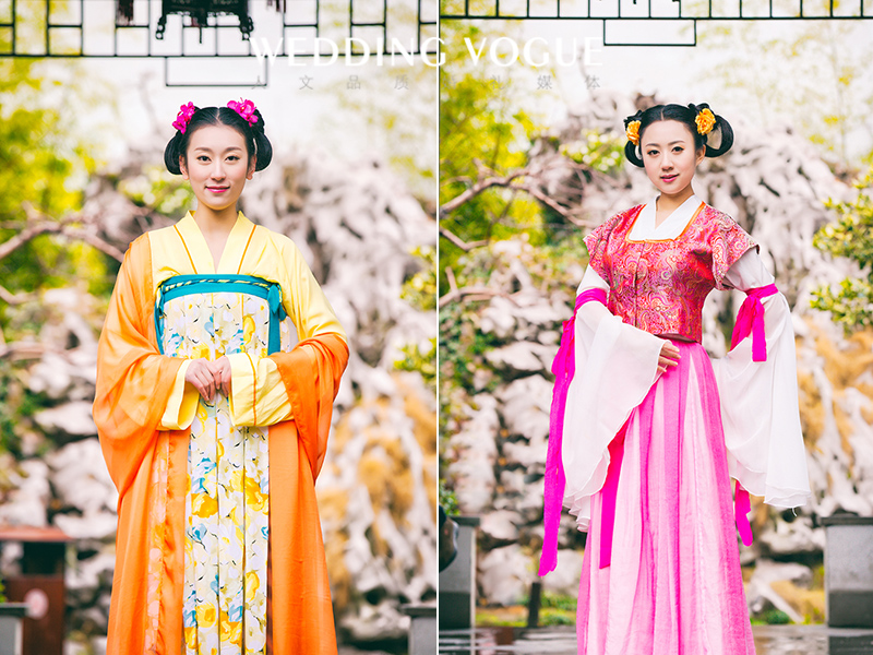 第一组:男装为圆领袍靴,女子拖尾大袖对襟衫加齐胸裙。