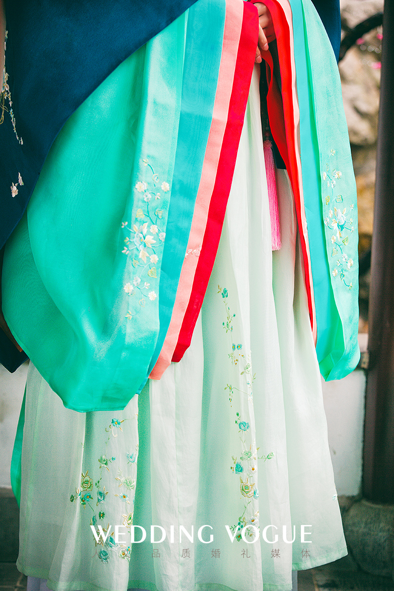 服饰细节:面料采用重磅真丝、韩府真丝绸缎、高档真丝雪纺纱、织锦缎、天然棉麻印花、加苏绣和手推绣等完成。