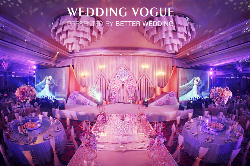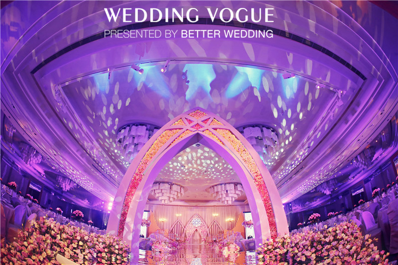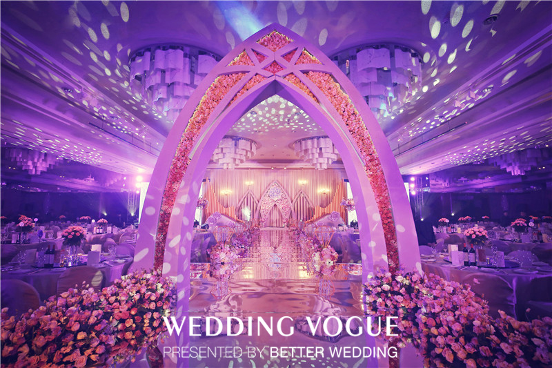 宴会厅的大门开启,一道尖顶拱门跃入眼帘。原来新郎在浪漫美丽的巴厘岛向新娘求的婚,让新娘激动不已,为了纪念当时求婚的美景,百特婚礼非常用心地将此细节嵌入了婚礼布置中,将主舞台设计成了巴厘岛特有的尖顶建筑,再辅以美丽的粉色玫瑰,而每位宾客桌上的花饰也是玫瑰,整个现场有着完美和谐的统一。让宾客们瞬间享受到了犹如置身海岛般的异域风情和舒适清凉。