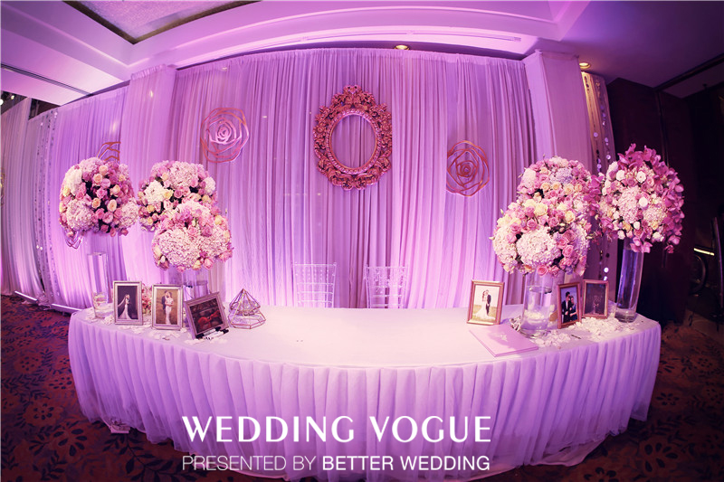 刚刚踏进凯悦酒店的宴会厅,宾客们就被签到区的玫瑰花海迷住了。每一位宾客无不驻足欣赏,拍照留念。新娘是位90后清新美丽的女孩,温柔可人,为了与新娘温婉美丽的外表和性格相辉映,百特婚礼在与新人多次沟通之后,在婚礼签到区和迎宾区布置了大量粉红玫瑰,花团锦簇,既丰富温馨又错落有致,既有层次感又不乏隆重,让人倍感甜蜜温馨。