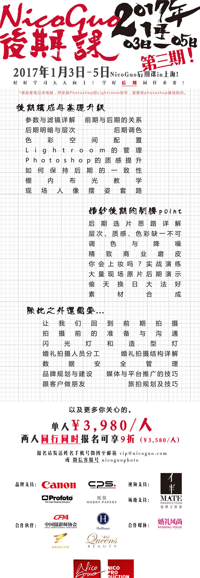 错过了此次课程的学员,也不用遗憾,摄影师Nico Guo 2017年1月Workshop报名已经开始,具体详情见海报。