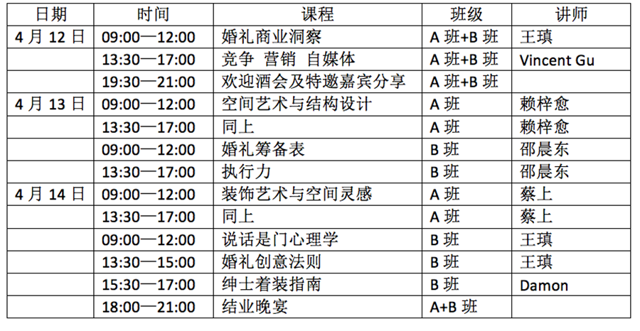 针对人群:婚礼策划师(A班)婚礼主持人(B班)一天大课,两天分班。