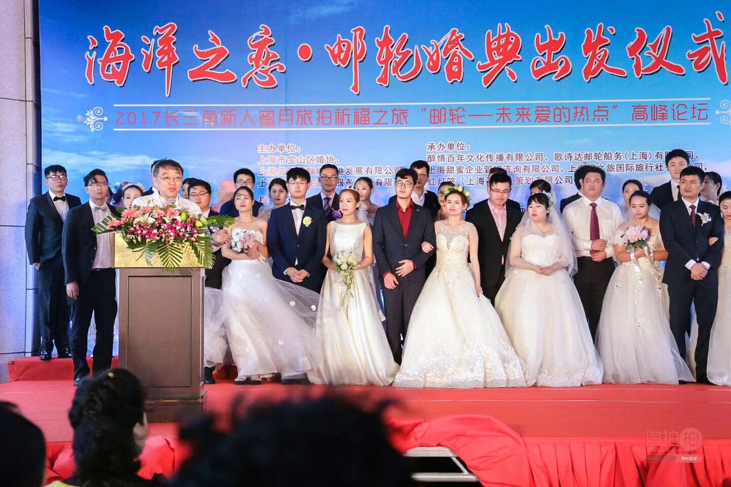 下午,上海宝山邮轮港码头洋溢着欢乐而甜蜜的气氛,来自上海、江苏、浙江、安徽的15对新人身着婚纱齐聚邮轮